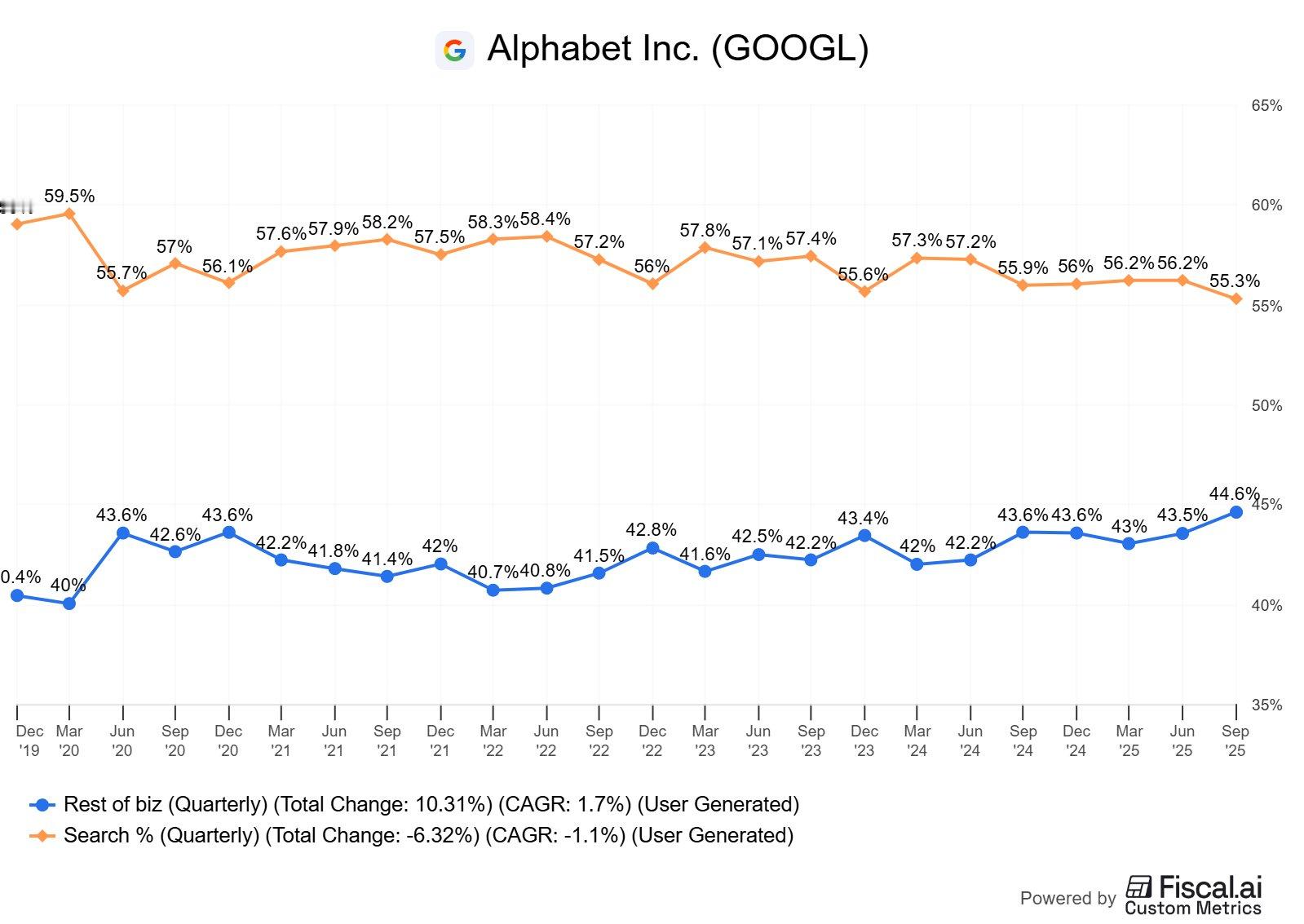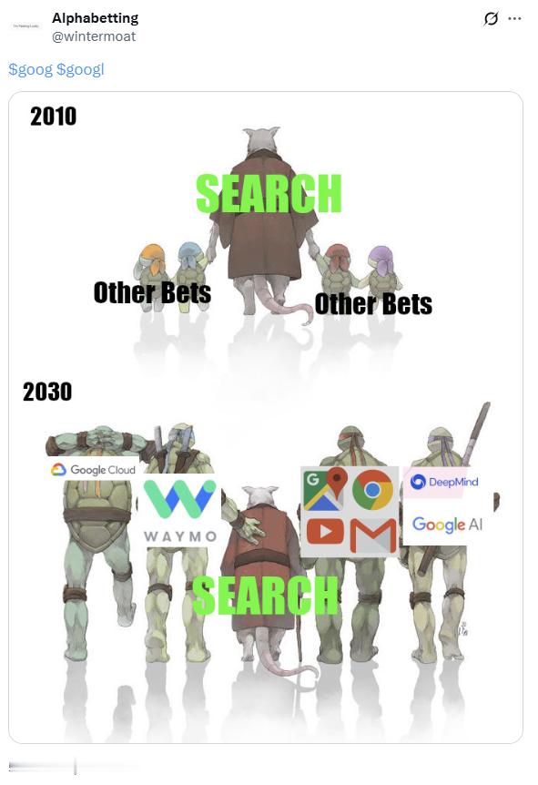 谷歌最新的营收中搜索占比 55%,2010 年是 66%,用了十五年降低了 11%。
