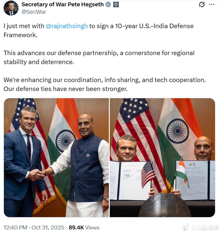 我刚刚与印度防长拉杰纳特·辛格会面,签署了一项为期10年的美印防务框架协议。