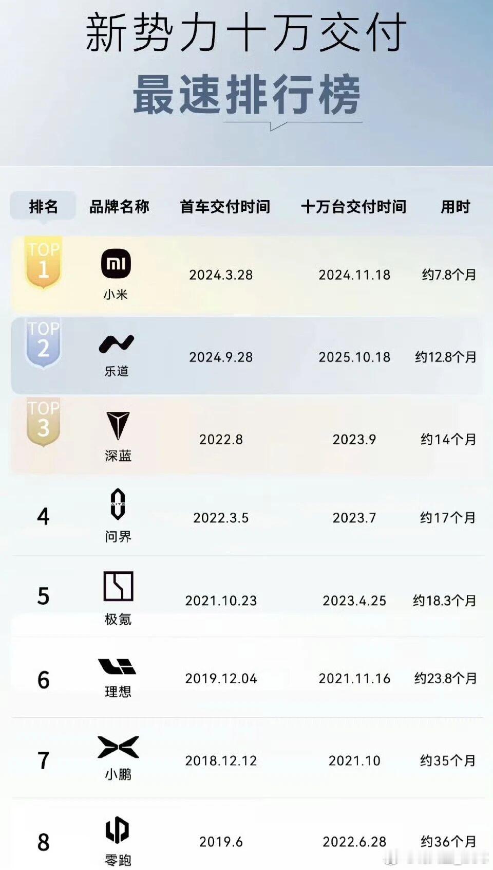 对比图2新势力,十万交付最快的品牌——小米,也得7.8个月。