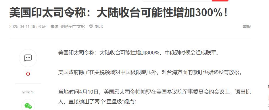 特朗普改变台湾称呼后,美国印太司令警告,大陆收台可能性增300%   先说说这改称呼里的猫腻,以前美国文件里提台湾,还会写上“中国台湾地区”,这次直接把这关键的标注给删了,字里行间都在故意模糊“台湾是中国一部分”这个事实。   这肯定不是写错了,你想啊,之前民进党当局刚硬着头皮把军费提到GDP的5%,明年的军事预算都飙到1兆新台币了,说白了就是想砸钱抱美国的大腿,结果换回来的就是这么个“模糊态度”的试探,说到底就是美国把“用台湾牵制中国”的小心思,藏在关税文件的字里行间了。   再看帕帕罗说的“风险涨三倍”那狠话,根本就是这场政治表演的配套戏。他对着媒体一个劲儿说“大陆统一的进度变快了”,可压根不提是谁先挑的事儿。   要我说啊,美国嘴上天天喊着“维持台海现状”,实际干的却是另一回事儿,之前答应卖给台湾的军火,还有6554亿元的货没交,就算送过去的,要么是没人要的火山布雷装备,要么是过期的子弹、发霉的防弹背心;转头又把台积电一半的高端生产线和1650亿美元的投资都拉回美国,把台湾当“提款机”还不够,还要把它的产业价值榨干才甘心。   美国政府的心思其实一点都不复杂。对特朗普来讲,快到选举了,拿台湾问题刷存在感,既能讨好国内的选民,又能给大陆添点麻烦;对美国那些做军火生意的巨头来说,台海局势越紧张,台湾买军火的订单就越稳,就算是堆破烂也能卖高价。   从美国的印太战略来看,把台湾当成“棋子”,就能拖慢大陆发展的速度。可他们偏偏忘了,台湾从来不是美国能随便摆弄的“筹码”,而是中国核心利益里必须保住的东西,这一点从开始到现在就没动摇过。   面对美国这波挑衅,大陆的反应特别稳,一点不慌。国台办发言人直接把本质说透了,是民进党当局勾结外面的势力搞“台独”、挑事,这才是台海紧张的真正根源。   嘴上说得够硬,行动上更实在,东部战区几十架战机直接飞过那所谓的“海峡中线”,军舰还配合着搞联合战备巡逻,用实际行动告诉所有人,根本就没有什么“海峡中线”,中国的领海领空,解放军想在哪巡逻就在哪巡逻。再看台军搞的那5天“紧急备战演习”,在解放军的整体威慑力面前,顶多就是装装样子的花架子,根本没用。   其实帕帕罗说的“风险飙升”,根本说反了,真正在升级的,是“台独”分子和外面势力冒险的风险,不是大陆统一的风险。因为统一是历史发展的大趋势,节奏从来都在大陆手里,不会因为美国说几句狠话、改个称呼就被带偏。   再看台湾,现在被美国当成“二等殖民地”薅羊毛,经济被死死绑在政治战车上动弹不得,民进党当局喊的“捍卫主权”,说到底就是出卖民族利益的借口。   在这场没硝烟的较量里,美国政府的心思再精,也敌不过“两岸同属一个中国”的法律事实;美军的狠话再大声,也挡不住解放军保卫国家领土完整的脚步。民进党当局想靠抱美国大腿搞“台独”,肯定是死路一条。谁能笑到最后?答案早就藏在历史发展里了,中国实现完全统一,本来就是早晚会发生的事。