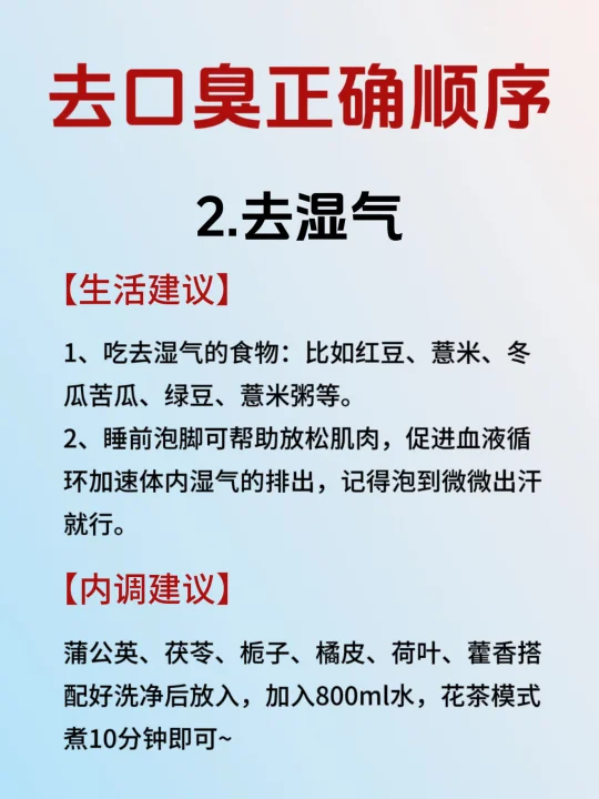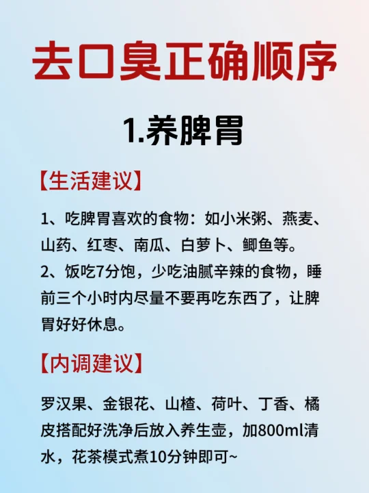 👉️很多人嘴里发苦、舌苔厚腻、说话有异味,第一反应是拼命用漱口水 . 但其实,光清洁口腔治标不治本❗️ . 如果脾胃功能弱,消化不及时,食物容易滞留产生异味 . 就像厨房垃圾没清理,不停喷空气清新剂,可源头问题还在 . 所以调理的第1⃣步,其实是把"消化"理顺 . 1⃣先养脾胃 . 脾胃是消化核心,负责运化食物避免积食产味 . 经常暴饮暴食、爱吃生冷、饮食不规律的人,脾胃容易受损 . ✅️用山药、茯苓加几颗红枣煮粥,早餐吃一碗,温和养护肠胃 . 每天饭后站立十分钟,用手掌顺时针轻揉腹部,帮助消化吸收 . 关键要细嚼慢咽,给脾胃减负 . 2⃣再去湿气 . 湿气重的人常觉得口舌黏腻、舌苔厚腻有齿痕、嗓子有痰 . 这种状态下,浊气不降,清新之气难升 . ✅️炒薏米配赤小豆煮水当茶喝,是个简单有效的方法 . 每天快走二十分钟,让身体微微发汗,帮助水湿代谢 . 少吃甜腻重口味食物,避免加重湿气 . 3⃣后清肝火 . 等脾胃功能改善了,湿气减轻了,这时候清火才真正有效 . ✅️菊花金银花茶,比较清爽,适合经常熬夜的人 . 隔天喝一次就行,不用天天饮用 . 晚上11点前入睡,避免熬夜加重肝火 . 保持心情愉悦,少生气少焦虑 . ✅什么时候算有好转?可以看看这几个变化: 1、早晨起床嘴里清爽不黏腻 2、舌苔变薄,齿痕减轻 3、近距离说话不再尴尬 4、消化变好,很少胀气反酸 . 改善口臭这件事,急不得 顺序对了,效果自然来 先让脾胃强起来,再祛除湿气,最后清理肝火,才能真正告别困扰👋 ·