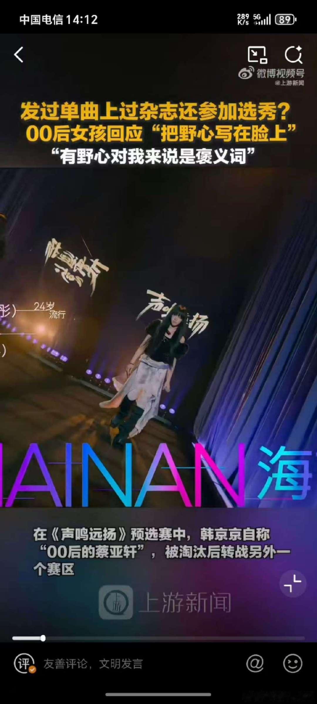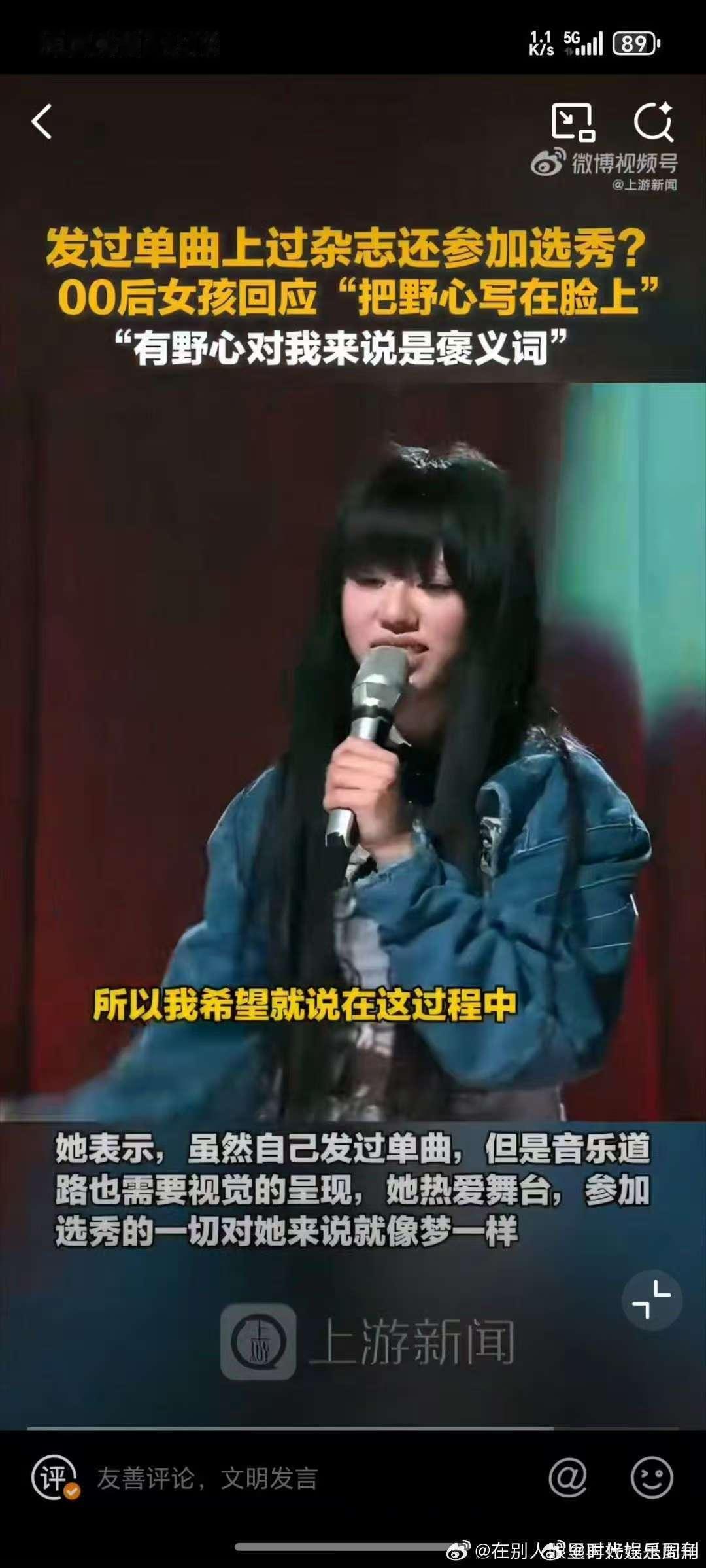 00后女孩回应出过单曲还参加选秀00后选秀女孩认为野心是褒义词敢追梦的女孩最酷!出过单曲还参加选秀,野心背后是实打实的努力,不畏惧他人眼光,这样的野心就该被喝彩~