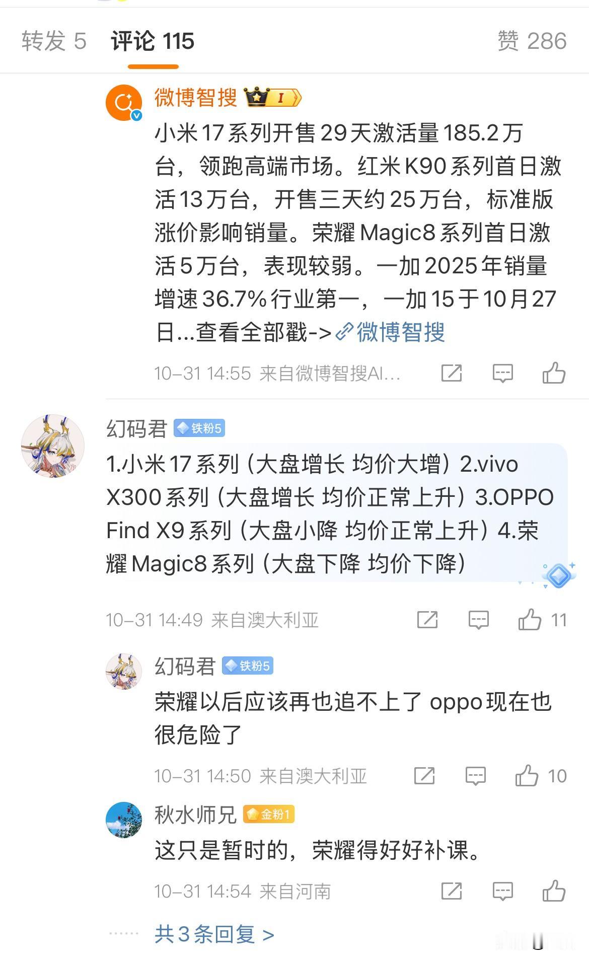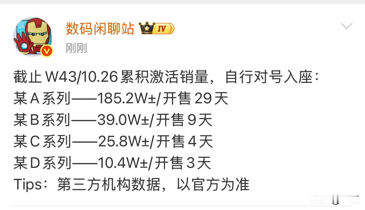 数码闲聊: 截止10月26号的激活量来! 今天下午,数码站发出了,从A系到D系,四个品牌,截至26号的激活量。 至于以上品牌分别是哪些,相信屏幕前的老师们一眼就能够看清楚,因为相应的品牌方还没有把确定的数据发出来,所以他这算是抢先版吧。 目前小米17系列已经卖出去了29天,目前的截止激活量是185.2万,迟迟没有突破200万的原因就是他们的小米17 Pro 以及小米17 Pro Max,这两个版本在市场上太缺货了。 所以到现在为止还没有突破,不过按照这个速度来看的话,到明天之前还是有能够突破的。
