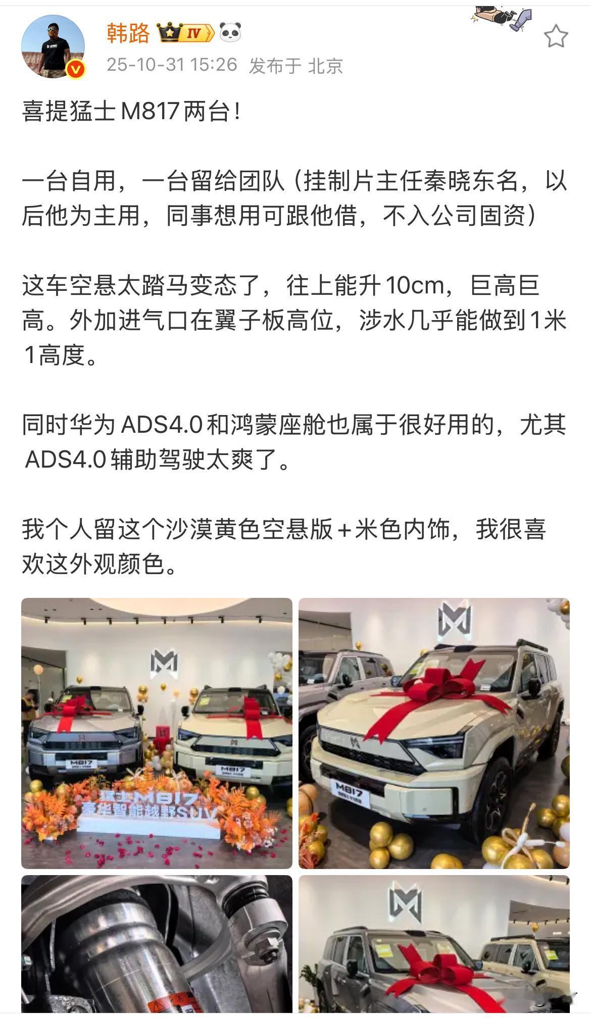 太舍得了:韩路买了两台猛士M817! 关键是他一台平时自己用,而另外一台留给团队,而且还是用的他们公司制片主任秦晓东的名下,也就是说不是用的公司的名义去买的,并且不入公司固资。这得有多相信同事才行! 这个车其实有两个版本,但是两个版本都够做到涉水几乎1米1。 一个是不带华为驾驶系统的,另外一个就是带的,他具体大概的是华为ADS4.0,以及鸿蒙座舱,开着这个车去翻山越岭长途跋涉的时候,一键开启ADS4.0辅助驾驶,真的能够省很多事。 而且现在这个车也就小几十万,上次他们还专门开到新疆去做了一起节目,这个车的表现不输吉普,由于他是新能源可以外放电,再加上它有辅助驾驶系统,开起来的感受与传统的那种很强悍的越野车,还真的完全不一样的感觉。
