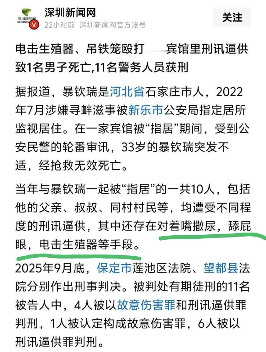 河北石家庄,33岁男子遭多次刑讯逼供身亡,妻子殡仪馆看到丈夫尸体“全身都是伤"! 生者生前遭电击生殖器、对嘴撒尿、舔屁眼,法院: 包括殴打、电击、“开飞机”、吊铁笼;! 网友说,河北石家庄这帽子真是厉害,太吓人了! 正常审讯就算了,没想到帽子叔叔刑讯逼供,而且还玩的那么花,让人开眼了!一定要重罚这11个帽子叔叔,知法犯法,罪加一等! 最后希望是异地法院审理这几个帽子!一定要严惩,严惩!