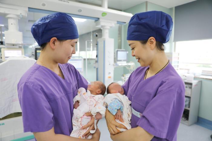 正如术前所料,由于产妇高龄、双胎及既往手术史,胎儿娩出后出现了子宫收缩疲软、出血较多的情况。紧要关头产科团队临危不乱,凭借丰富的临床经验,果断、迅速施行宫腔纱条填塞术,这一关键性操作效果立竿见影,有效控制住出血,为产妇保住了子宫。娩出的35周早产龙凤胎宝宝体重分别为1900、1950克,随后新生儿科团队立即展开救治,转至NICU进一步治疗。