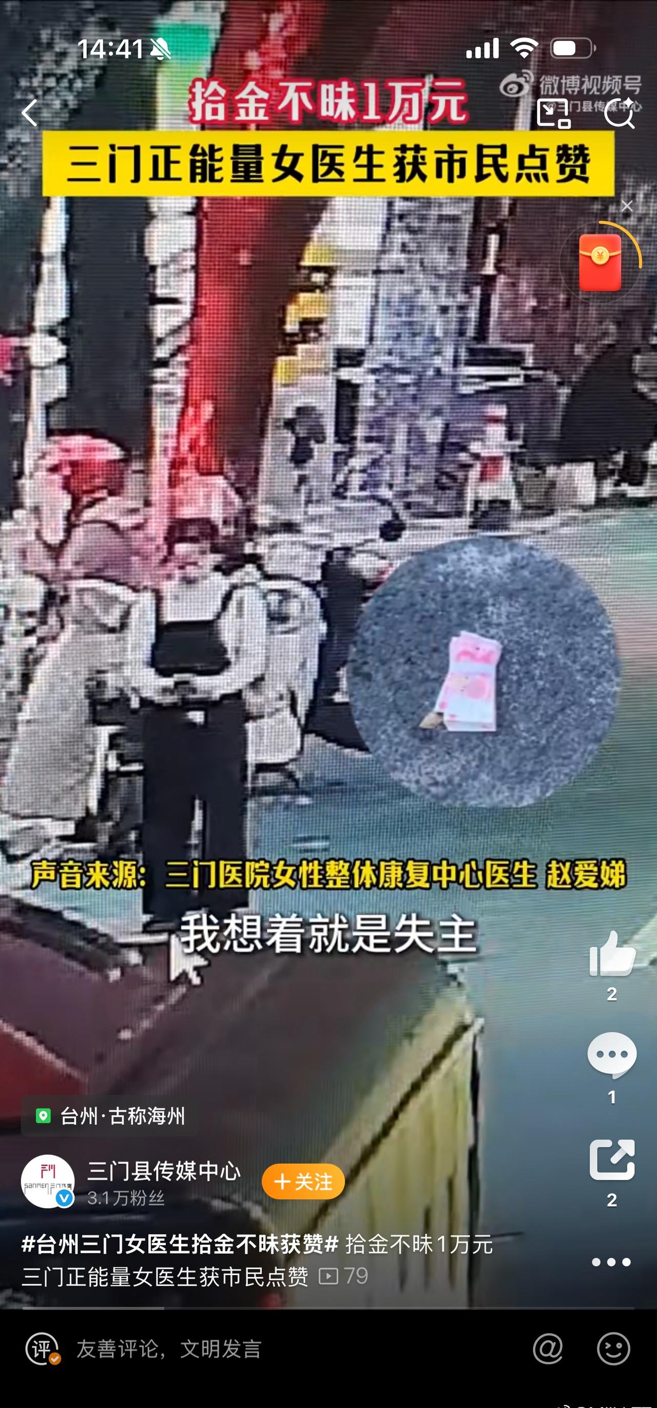 台州三门女医生拾金不昧获赞三门女医生拾金不昧,万元现金物归原主!用行动诠释医者仁