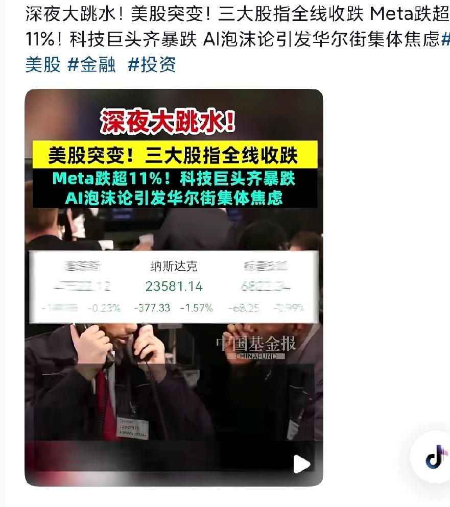 深夜暴跌11% | 美股创三年最大跌幅 | AI支出担忧蔓延 昨晚美股市场真是跌得够呛,科技板块整体遭遇重挫,Meta股价一天之内就暴跌超过11%,创下了三年来的最差表现,英伟达的市值也蒸发了近千亿美元!不过,专家们火速出来喊话:大家先别慌,这可不是AI泡沫破灭的信号! 数据上看,纳斯达克指数下跌了1.57%,芯片股普遍承压,AMD和英伟达都出现了回调。连在海外上市的那些“熊猫企业”也没能幸免,百度和阿里单日跌幅都超过了3%。市场里担忧情绪蔓延,但分析师们强调,这只是一次技术层面的调整。 高盛CEO提醒要注意债务风险,财政部长贝森特直接指出美联储的预测模型已经失灵,计划在12月选拔新主席来推动改革。尽管短期波动挺剧烈,但大多数投资机构还是长期看好AI领域,觉得这次回调反而是个布局的好机会。 每次市场起伏都是考验真实价值的时候。你觉得现在科技股的投资时机怎么样?快来分享你的抄底心得吧!美股动态 科技投资