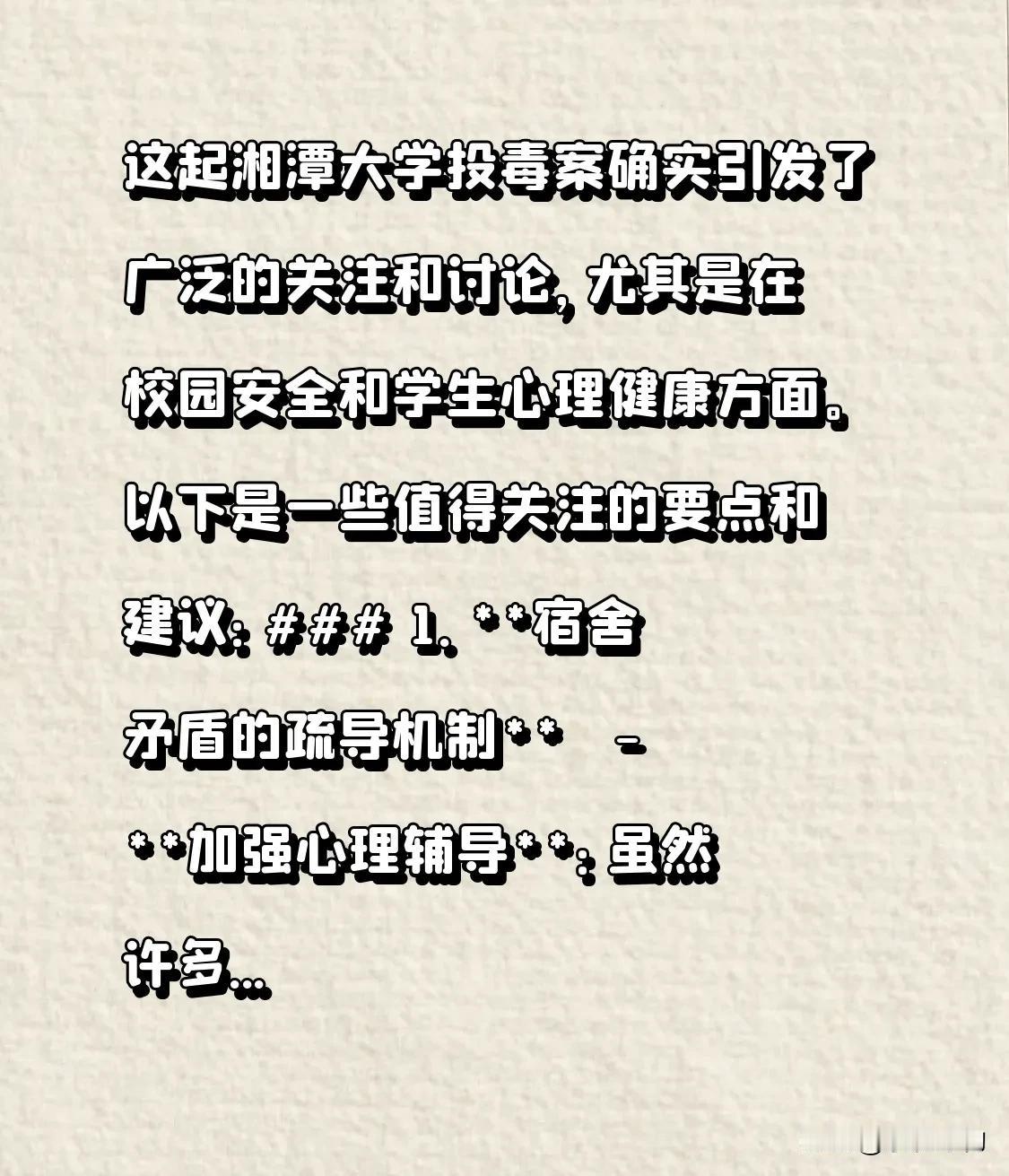 这起湘潭大学投毒案确实引发了广泛的关注和讨论,尤其是在校园安全和学生心理健康方面。以下是一些值得关注的要点和建议: 1. **宿舍矛盾的疏导机制** - **加强心理辅导**:虽然许多大学已经设立了心理辅导员,但学生可能因为担心隐私或面子问题而不愿主动寻求帮助。学校可以提供更隐蔽的反馈途径,如匿名心理咨询或在线咨询平台,让学生能够更自由地表达情绪。 - **建立宿舍调解机制**:学校可以设立宿舍调解员或调解小组,专门处理宿舍内部的矛盾,及时介入,避免小摩擦升级为大冲突。 2. **校园安全管理** - **加强宿舍安全检查**:定期进行宿舍安全检查,防止学生携带危险物品进入宿舍。同时,加强对网购物品的监管,尤其是可能涉及危险物品的快递。 - **提高安全意识**:通过讲座、宣传册等形式,提高学生的安全意识,让他们了解如何应对潜在的威胁和危险。 3. **司法程序的高效运转** - **法治教育**:学校应加强法治教育,让学生了解法律的严肃性和违法行为的后果,增强他们的法律意识。 - **快速响应机制**:学校应建立快速响应机制,一旦发生类似事件,能够迅速介入并配合司法机关进行调查和处理。 4. **家长和学生的参与** - **家长沟通**:学校应加强与家长的沟通,让家长了解学校的安全措施和学生的心理状态,共同关注学生的健康成长。 - **学生参与**:鼓励学生参与校园安全管理,如设立学生安全委员会,让学生能够提出自己的建议和意见。 5. **处理宿舍矛盾的建议** - **冷静沟通**:遇到宿舍矛盾时,首先应冷静下来,尝试与室友进行沟通,表达自己的感受和需求。 - **寻求第三方帮助**:如果沟通无效,可以寻求宿舍管理员、辅导员或心理辅导员的帮助,避免矛盾进一步激化。 - **保持尊重**:在处理矛盾时,保持对室友的尊重和理解,避免使用过激的言语或行为。 6. **社区讨论** - **分享经验**:家长和同学们可以在评论区分享自己的经验和建议,讨论如何在校园中更好地处理矛盾和加强安全措施。 - **共同探讨**:通过社区讨论,集思广益,共同探讨如何创造一个更安全、更和谐的校园环境。 这起事件提醒我们,校园安全不仅仅是学校的责任,也需要学生、家长和社会的共同努力。通过加强心理辅导、安全管理和法治教育,我们可以共同预防类似悲剧的再次发生。 大学宿舍投毒案 校园投毒案 高校投毒案 研究生投毒案 长沙学生中毒 无差别投毒 湘潭校园投毒案