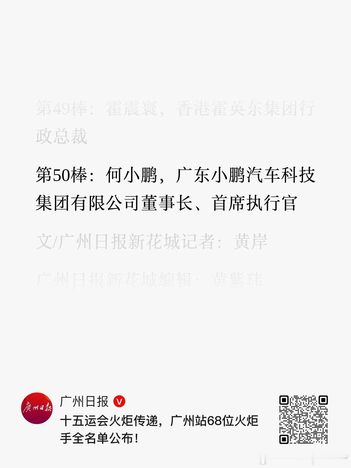 10月31日,第十五届全运会四地压轴火炬手名单正式公布,小鹏汽车董事长、CEO 何小鹏当选广州站第 50 棒压轴火炬手,成为港澳广深四城中唯一以科创企业家身份压轴的传递者 —— 深圳、香港、澳门三地压轴火炬手分别为奥运冠军刘虹、击剑运动员佘缮妡、空手道选手郭建恒,均为杰出体育健儿。