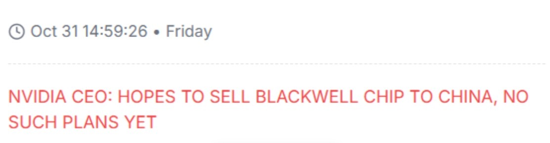🔻英伟达 CEO黄仁勋:“希望向中国出售 Blackwell 芯片,目前尚无具体计划。对英伟达在中国市场份额下滑感到失望。中国是一个极其庞大且重要的市场,人工智能研究发展迅猛,其地位根本无可替代。”
