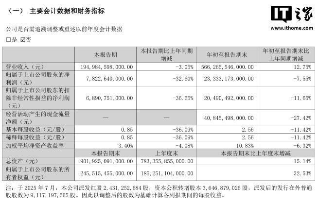 营收为 1949.85 亿元,同比下降 3.05%;净利润为 78.23 亿元,同比下降 32.60%。