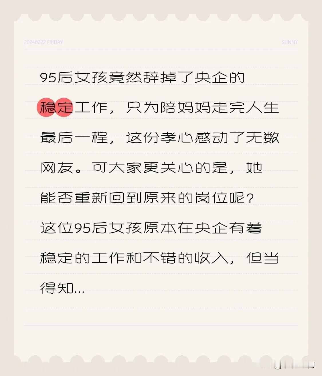 95后女孩竟然辞掉了央企的稳定工作,只为陪妈妈走完人生最后一程,这份孝心感动了无数网友。可大家更关心的是,她能否重新回到原来的岗位呢? 这位95后女孩原本在央企有着稳定的工作和不错的收入,但当得知妈妈病重时,她毅然决然地选择了辞职,回到妈妈身边陪伴。在妈妈最后的时光里,她寸步不离,用爱和陪伴为妈妈送行。这份深情厚意,让无数网友为之动容。然而,在感动之余,大家也开始关心起女孩的未来。毕竟,辞掉央企工作可不是小事,她能否重新回到原来的岗位,继续自己的职业生涯呢?据悉,原单位的领导已经得知了女孩的情况,并主动询问她是否有复职的意愿。这一举动无疑给女孩带来了希望,也让大家看到了企业的温暖和人文关怀。 女孩的孝心让我们感动,而企业的关怀也让我们看到了社会的正能量。希望女孩能够早日回到工作岗位,继续追逐自己的梦想。大家对于这件事有什么看法呢?快来评论区留言讨论吧!