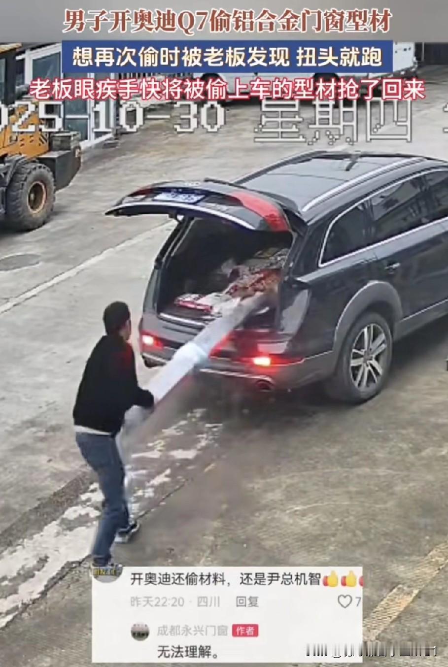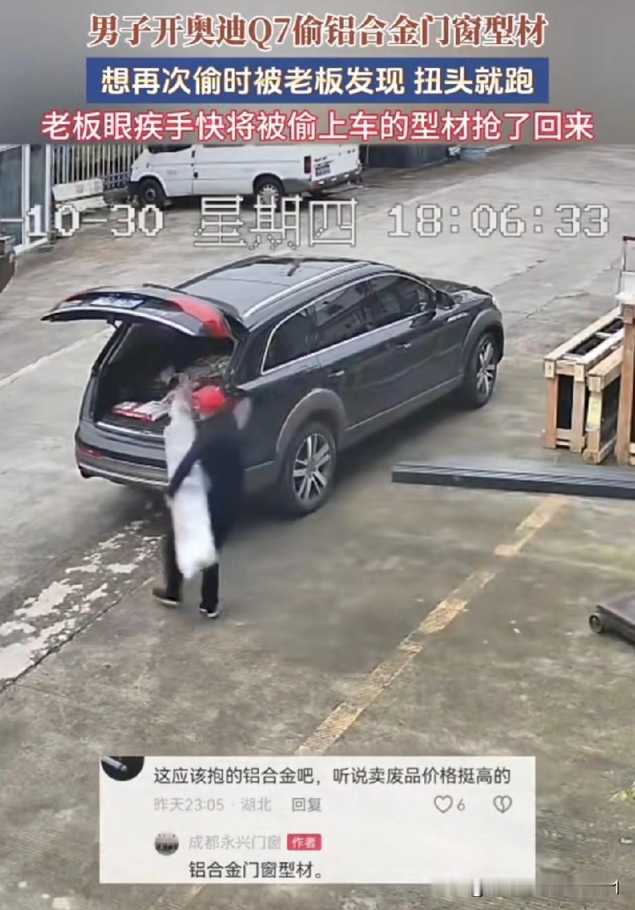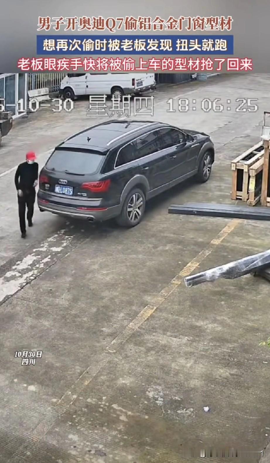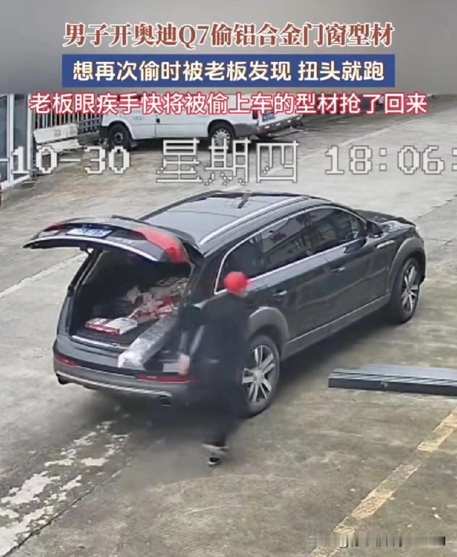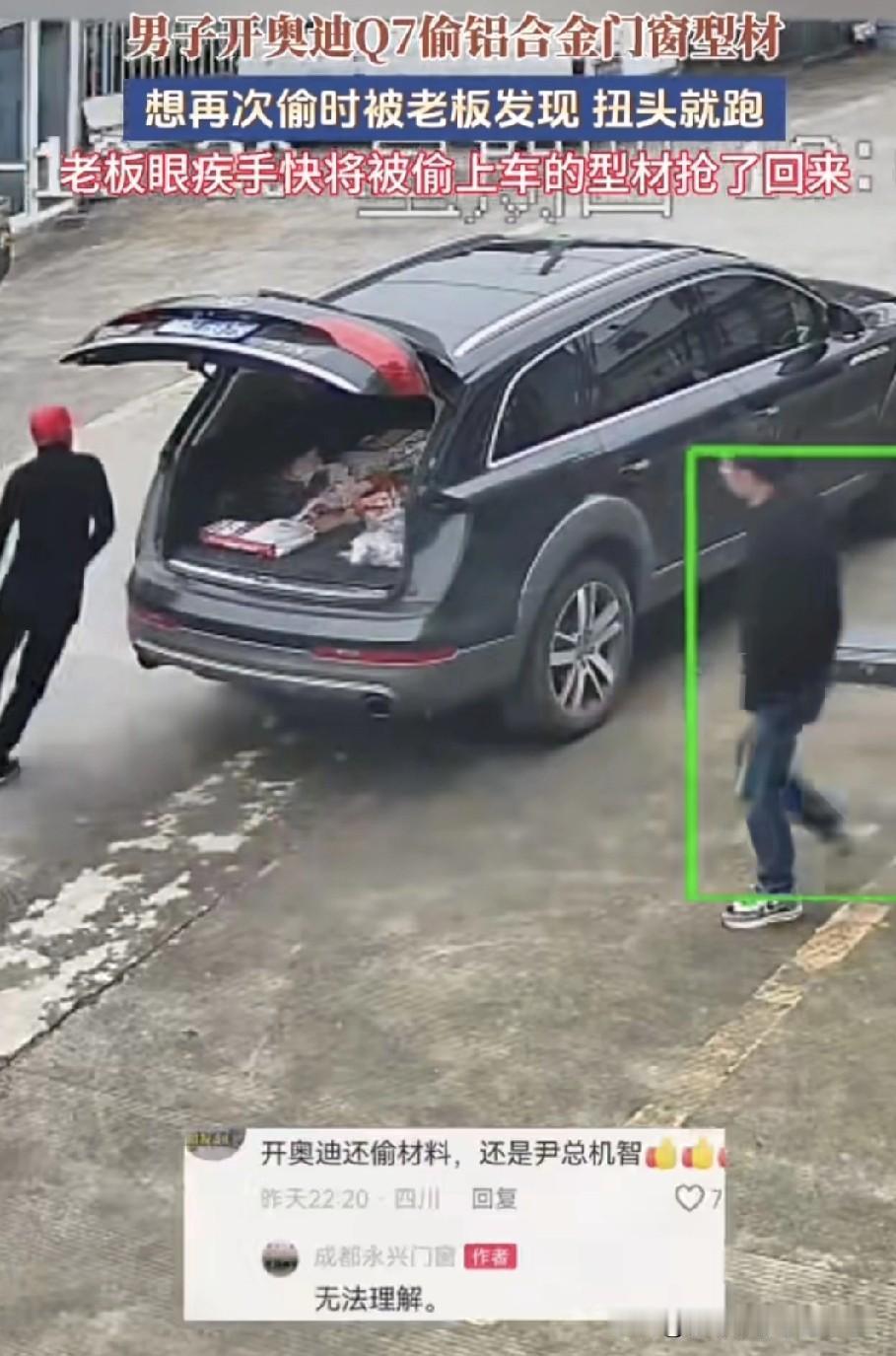 四川有一男子开着奥迪Q7,路过街边的门窗店,见店门外无人,便将车倒回去,把门外铝合金材料偷装到自己车上。之后他又想去偷其他东西,这时门窗店老板在店内发现了情况,赶忙出来,还没来得及询问,男子就掉头朝车奔去,开车一溜烟跑了。好在门窗店老板眼疾手快,把车上的铝合金材料抢了回来。 开豪车的不见得都是老板,也可能是小偷。都什么年代了,还敢公然行窃,真是胆子够大。这后续啊,他肯定得自食恶果。只要车不是套牌,他就跑不了。 这世上真是啥人都有,有人开奔驰逃单,有人开奥迪偷断桥铝。开着这么好的名牌车,却干出这种事,谁能想得到呢?