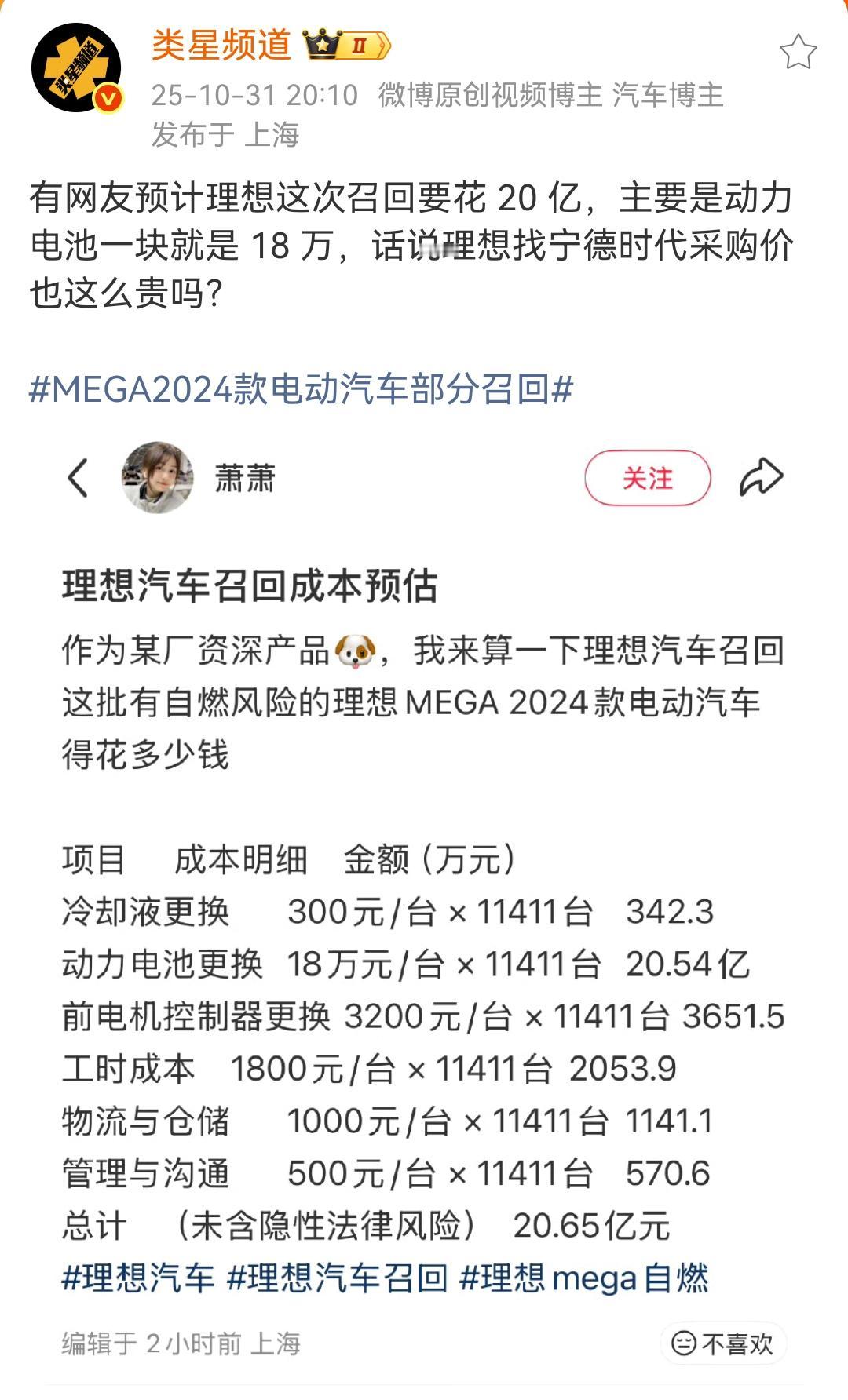 有网友预计理想这次召回要花 20 亿,主要是动力电池一块就是18 万! 个人觉得这个算法肯定是不对的,首先这一块动力电池的价格肯定不不需要18万元,其次动力电池回收还是有利用价值的,可以拆解用于诸如储能柜设施的建设,因为这个电池只使用了一年。 如果按照每一辆车10万块钱的成本,那支出的费用大概是11亿无论怎么算,此次更换全新电池的费用成本也是比较高的,但是从另一个角度来说,挽回了理想汽车的形象。 这个账当年福特汽车已经算过了,福特汽车当年就是因为觉得召回不划算,所以隐瞒了安全隐患,结果最后被报道出来,对福特造成的损失远高于召回造成的损失。