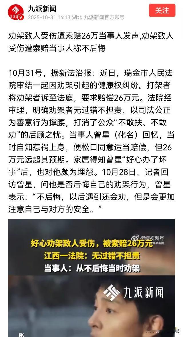 好心办坏事?江西瑞金,卤肉店老板曾某听见有人要打架,赶紧跑过去抱住其中一人劝架,谁知他松手的时候对方摔了一跤骨折了,事后,对方起诉曾某索赔26万。 来源:九派新闻, 曾某性格热情大方,好打抱不平,是某镇集贸市场一家卤肉店的老板。 二三年11月14日临近中午,曾某正在店里忙着收摊,突然听见不远处有人在吵架,曾某抬头一看,原来是卖药材的朱某和卖豆腐的老板娘梁某吵起来了。 朱某是开车卖东西的,他收完摊后准备将车倒出市场离开,可倒车过程中被梁某的三轮车挡住了路,两个人就这样吵了起来。 朱某脾气急,吵了几句后用手指着梁某的头骂了起来,梁某是市场里的豆腐西施,脾气也非常火爆,被朱某指着头后,梁某二话不说啪的给了朱某一耳光。 朱某被打懵了,反应过来后气得从旁边摊位上抢了一个铁勺就要打梁某。 卤肉店老板曾某见状,赶紧跑过去一手抱住朱某的腰,一手去夺他手里的铁勺,劝他说大老爷们不能对女人动手。 曾某将铁勺夺下来后,以为双方不会再动手了,就松开了朱某。谁知朱某一下子没站稳,一个趔趄摔了一跤。 朱某当时就起不来了,曾某等人赶紧将他送去医院,经检查,朱某左股骨受伤,构成了十级伤残。 民警介入调查并对此事进行调解,曾某也知道自己惹祸了,主动提出赔偿。 可让他没想到的是,朱某将这一切怪到了曾某头上,说都是他多管闲事才导致自己摔伤,张口就要曾某赔偿26万。 曾某虽然开了一家小店,但一家老小都要靠他养活,26万远远超过了他的预期,双方没有谈拢。 于是,朱某将曾某和梁某起诉了,要求他们共同对自己进行赔偿。 案发后,大家都说曾某是多管闲事才惹祸上身,家里人也不断埋怨他,曾某觉得自己没错,可又被官司缠的心力交瘁。 那么,本案从法律角度应该如何分析?此事的责任应该如何划分? 《民法典》第一千一百六十五条规定:行为人因过错侵害他人民事权益造成损害的,应当承担侵权责任。 侵权行为的构成需要行为人存在过错,且该过错行为导致了他人权益的损害。 本案中,朱某在与梁某发生纠纷时未能冷静处理,先是用手指着梁某头部叫骂,激化矛盾,之后又抢夺铁勺想要对梁某实施伤害行为,其行为本身存在明显过错。 这种过错行为是引发后续一系列事件的根源,朱某自身对于冲突的升级负有不可推卸的责任。 梁某在被朱某叫骂后,直接打了朱某一耳光,这一行为同样属于不恰当的处理方式,也是导致矛盾进一步激化的因素之一。 根据《民法典》第一千一百六十五条规定,梁某的这一行为侵害了朱某的人身权益,存在过错,应当承担相应的侵权责任。 《民法典》第一百八十四条规定:因自愿实施紧急救助行为造成受助人损害的,救助人不承担民事责任。 曾某看见朱某欲用铁勺伤害梁某,出于维护社会公共秩序、防止伤害发生或扩大的目的,跑过去抱住朱某并夺下铁勺,这一行为属于典型的劝架行为。 曾某的行为符合《民法典》第一百八十四条中自愿实施紧急救助行为的特征。 也就是说,曾某是出于好意,积极阻止可能发生的伤害事件,且在整个过程中,并没有证据证明其行为存在故意或过失,也不存在劝架行为超过必要限度的情况。 最终,一审认为曾某过去劝架是出于好意,是正义的善举,依法不应承担赔偿责任。 判被告梁某承担朱某住院费以及后续治疗费用50%的赔偿责任,赔偿朱某7.3万余元,其余损失由朱某自行承担。 一审判决后,曾某终于松了一口气,压在心里一年多的那口气,终于出了出来。 虽然曾某被判无责,但是他和朱某都在一个市场摆摊,大家抬头不见低头见,曾某心里过意不去。考虑到朱某确实损失比较大,曾某主动赔偿了朱某12000元。 曾某说,他不后悔过去劝架,以后遇见这种事他依然会出手帮忙,但是会更加注意自己和他人的安全,保持分寸!