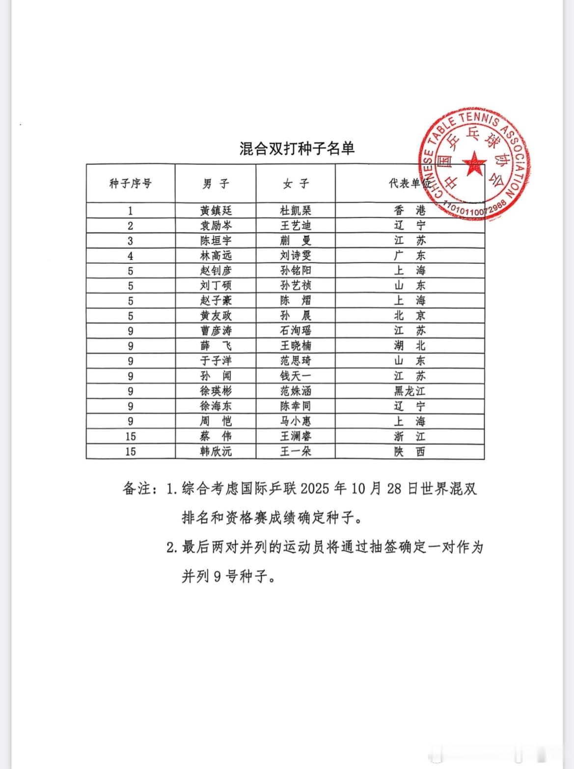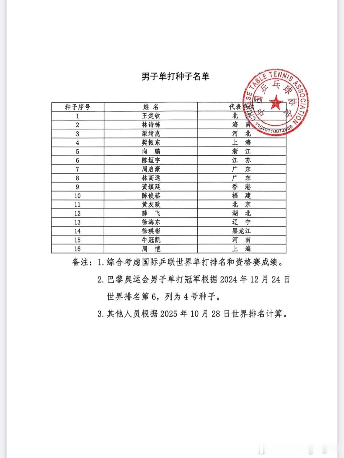 第十五届全国运动会乒乓球项目决赛(成年组)各比赛项目种子名单