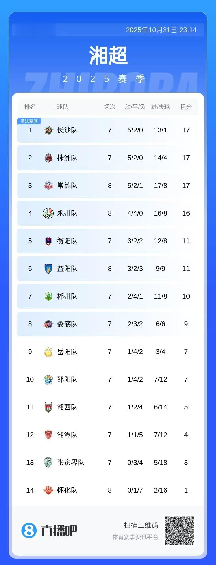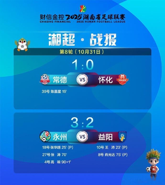 直播吧10月31日讯10月31日,湘超第8轮先赛两场,常德队1-0击败怀化队,常德队先赛情况下积17分,暂时追平长沙队和株洲队,因净胜球劣势,暂列第三位;永州队3-2击败益阳队,永州队落后榜首1分,暂时排名第四。