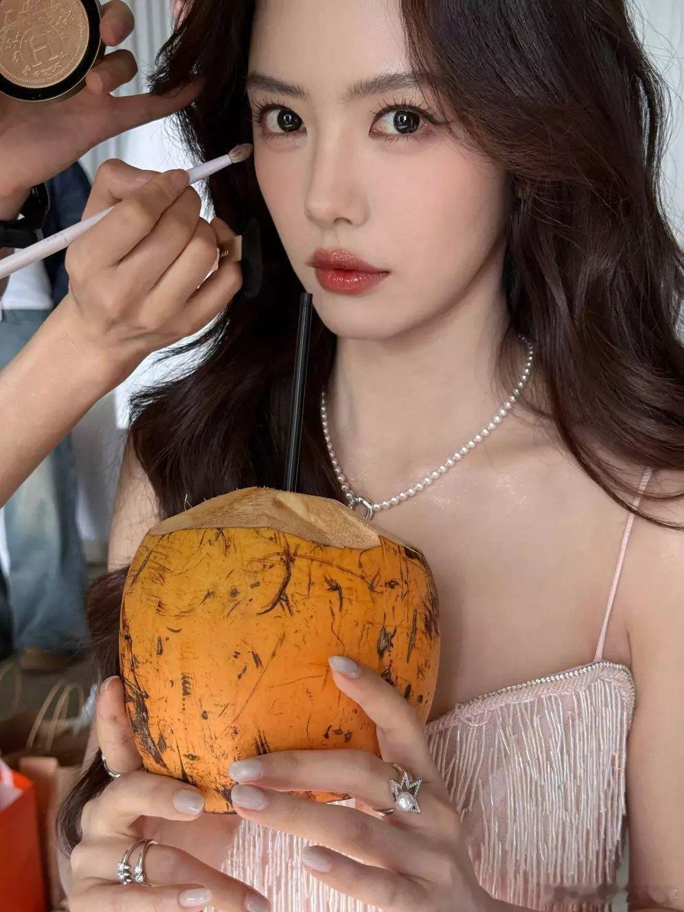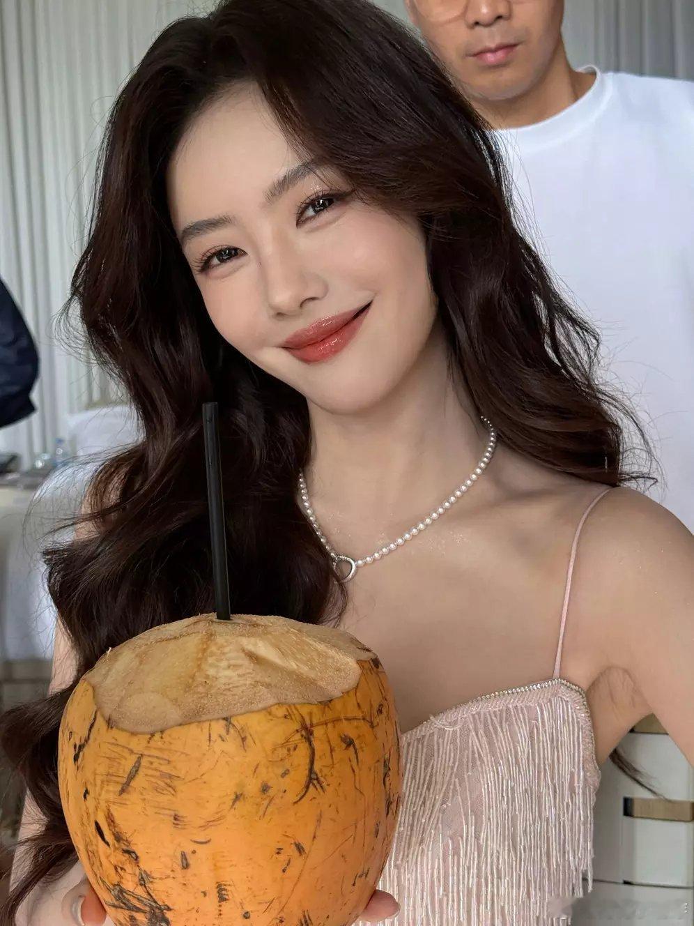分享娱乐[超话]分享娱乐 蔡文静穿粉色毛绒外套仙气十足 手捧椰子眼神灵动
