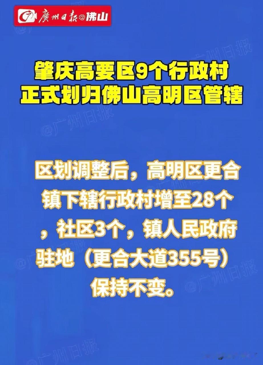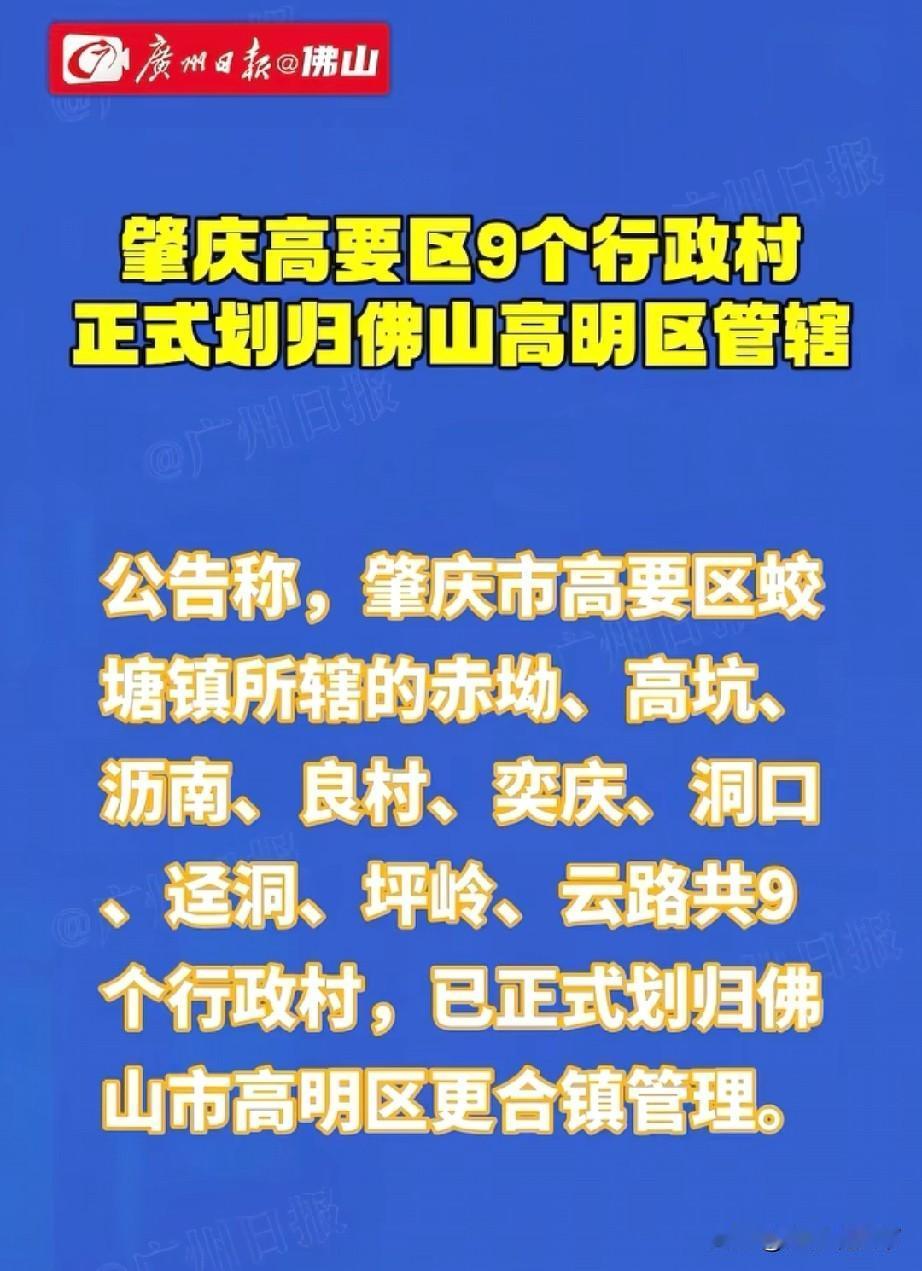 广东省肇庆市9村划归佛山市管理,行政区划调整又有消息了 广州日报消息,10月31号,肇庆市高要区蛟 塘镇所辖的赤坳、高坑、沥南、良村、奕庆、洞口,迳洞、坪岭、云路共9个行政村,已正式划归佛山市高明区更合镇管理。 这也是2025年为数不多的行政区划调整信息。 村镇行政区划调整,只需要省级行政单位同意就可以,不需要更高层审批,最近几年,行政区划调整被暂停,严控城市合并,但是民间讨论声音很多,因为历史地理等各种原因,各地都有存在不太合理的行政单位,适当做出调整,也是可以促进经济社会更好更快发展。肇庆村 佛山高明区拆改 高要划线 肇庆城市更新