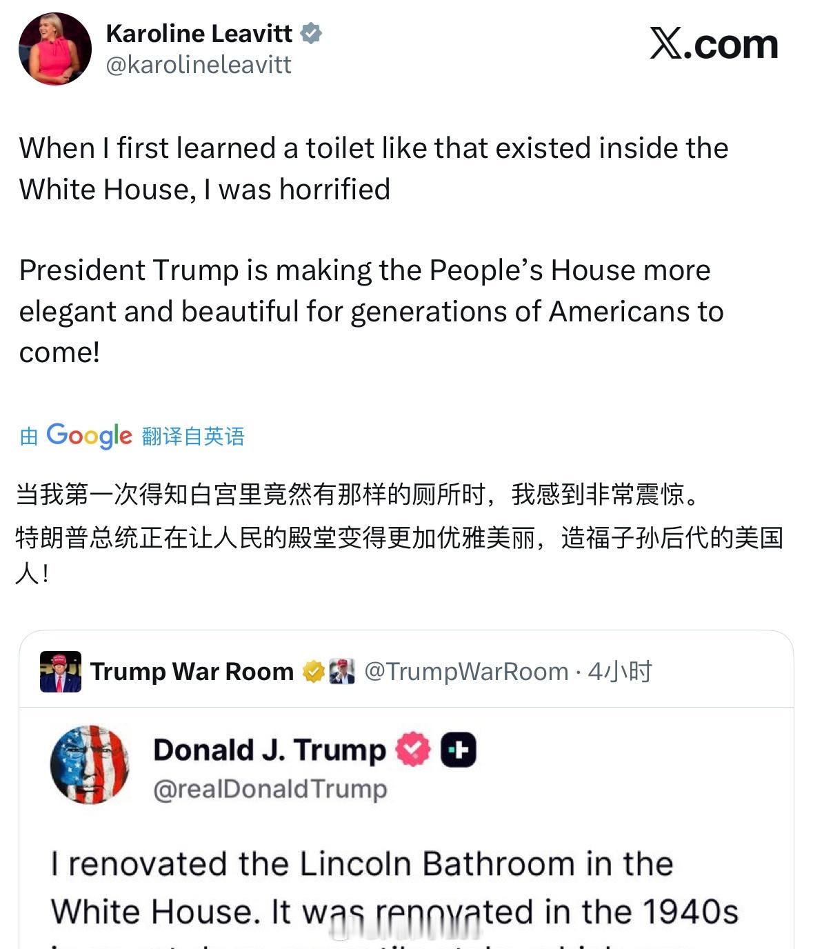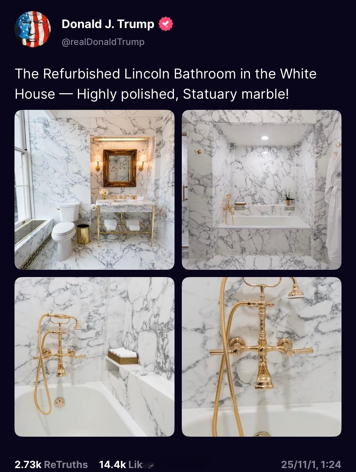 特朗普发文,表示对白宫的林肯浴室进行了改造,并以历史建筑学家的笔法进行说明