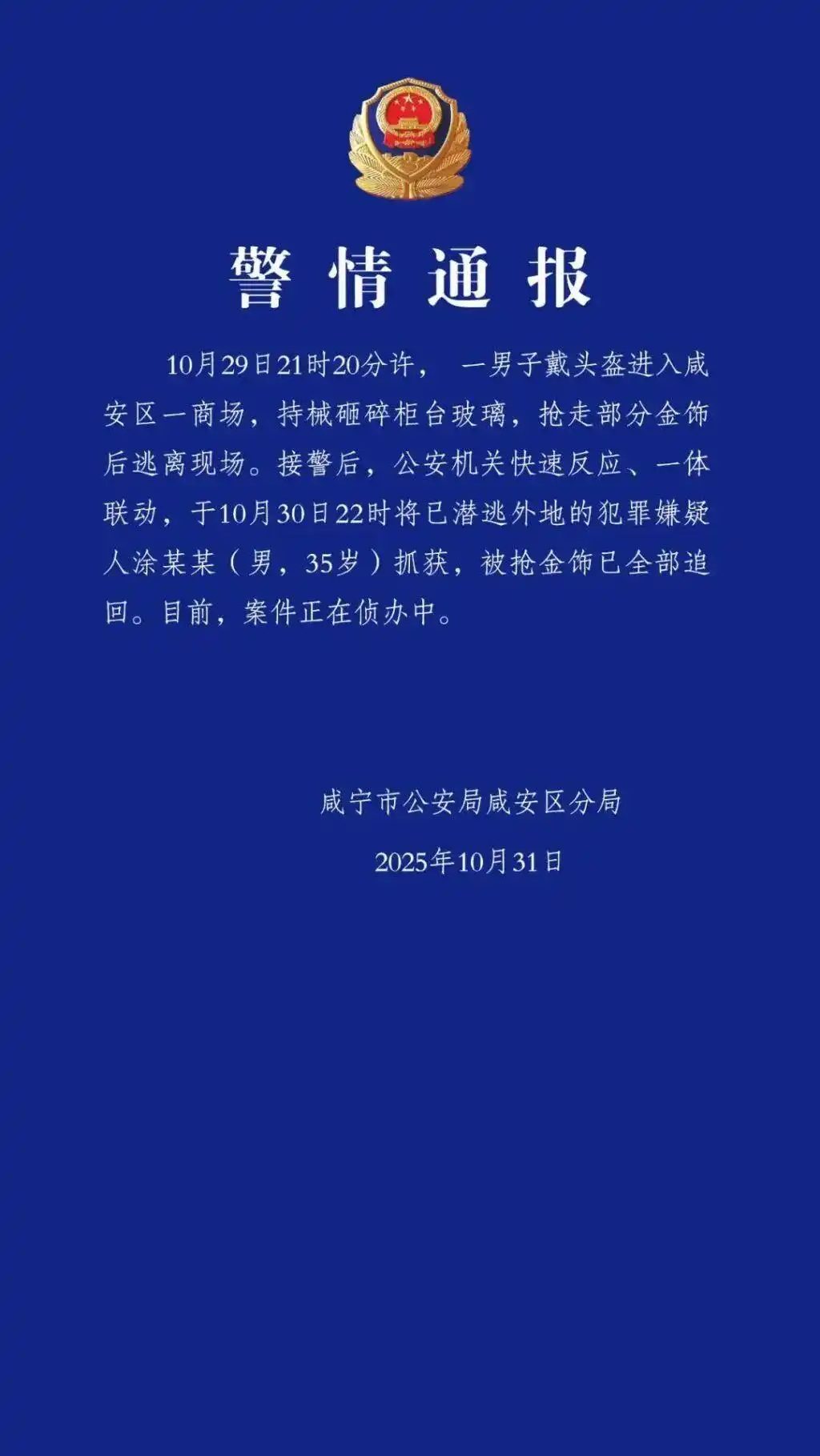 【#持械抢劫金店的涂某某被抓#】10月31日,湖北咸宁市公安局咸安区分局发布警情通报:10月29日21时20分许,一男子戴头盔进入咸安区一商场,持械砸碎柜台玻璃,抢走部分金饰后逃离现场。接警后,公安机关快速反应、一体联动,于10月30日22时将已潜逃外地的犯罪嫌疑人涂某某(男,35岁)抓获,被抢金饰已全部追回。目前,案件正在侦办中。(