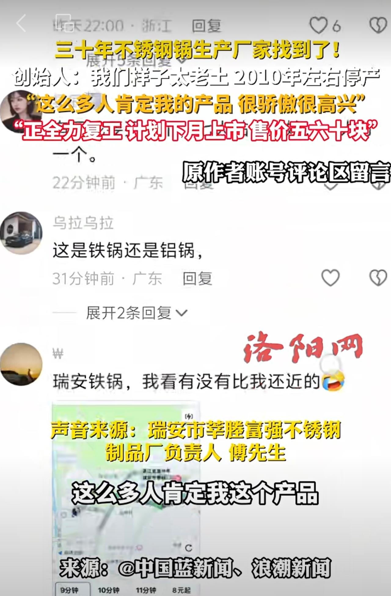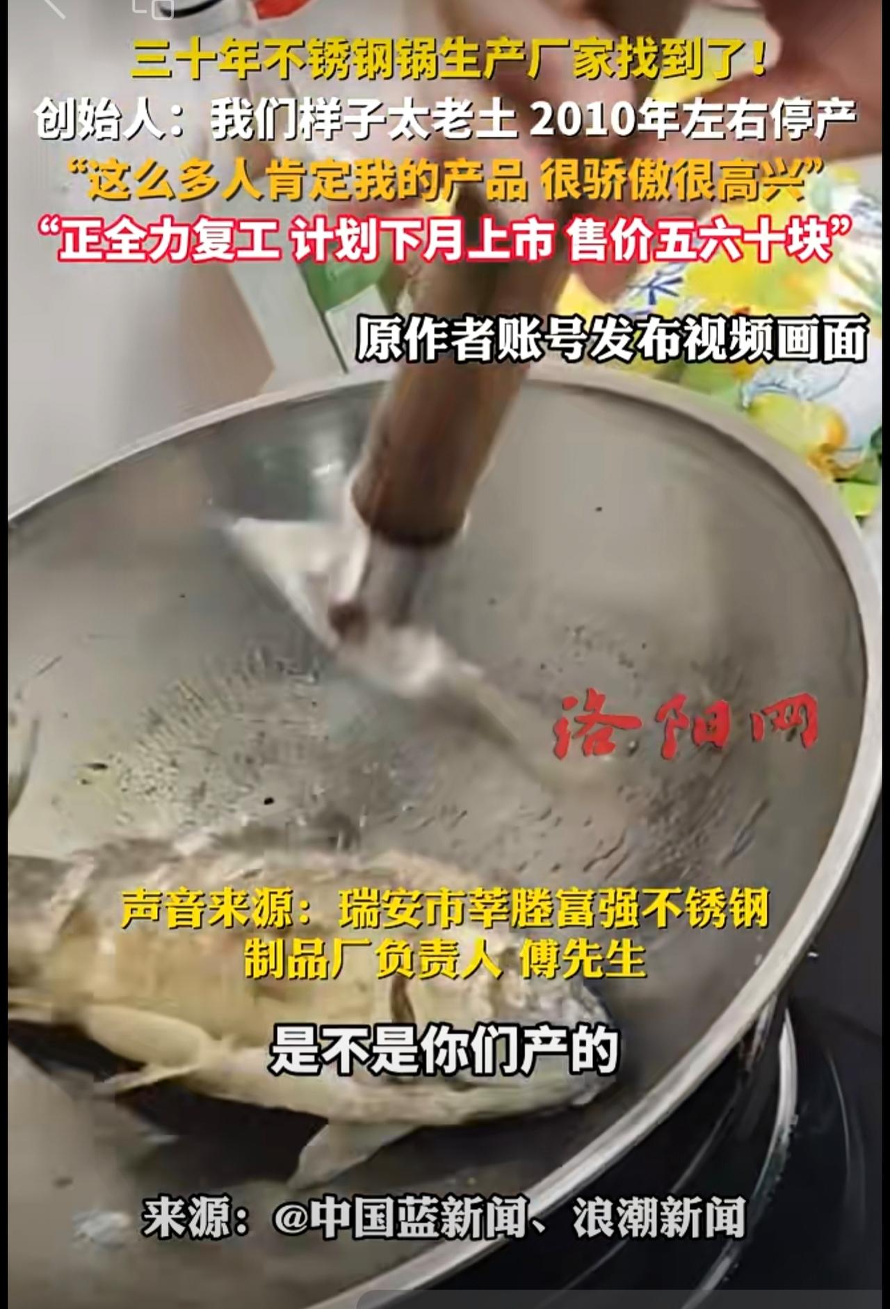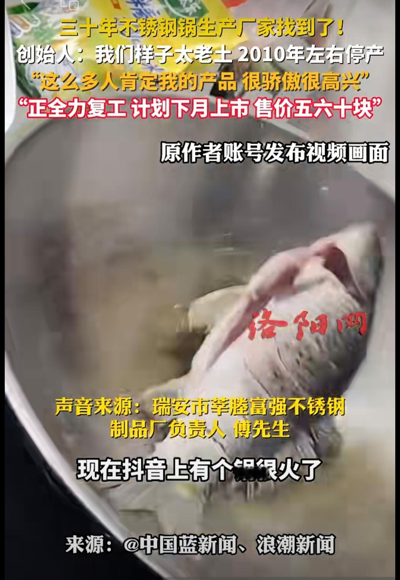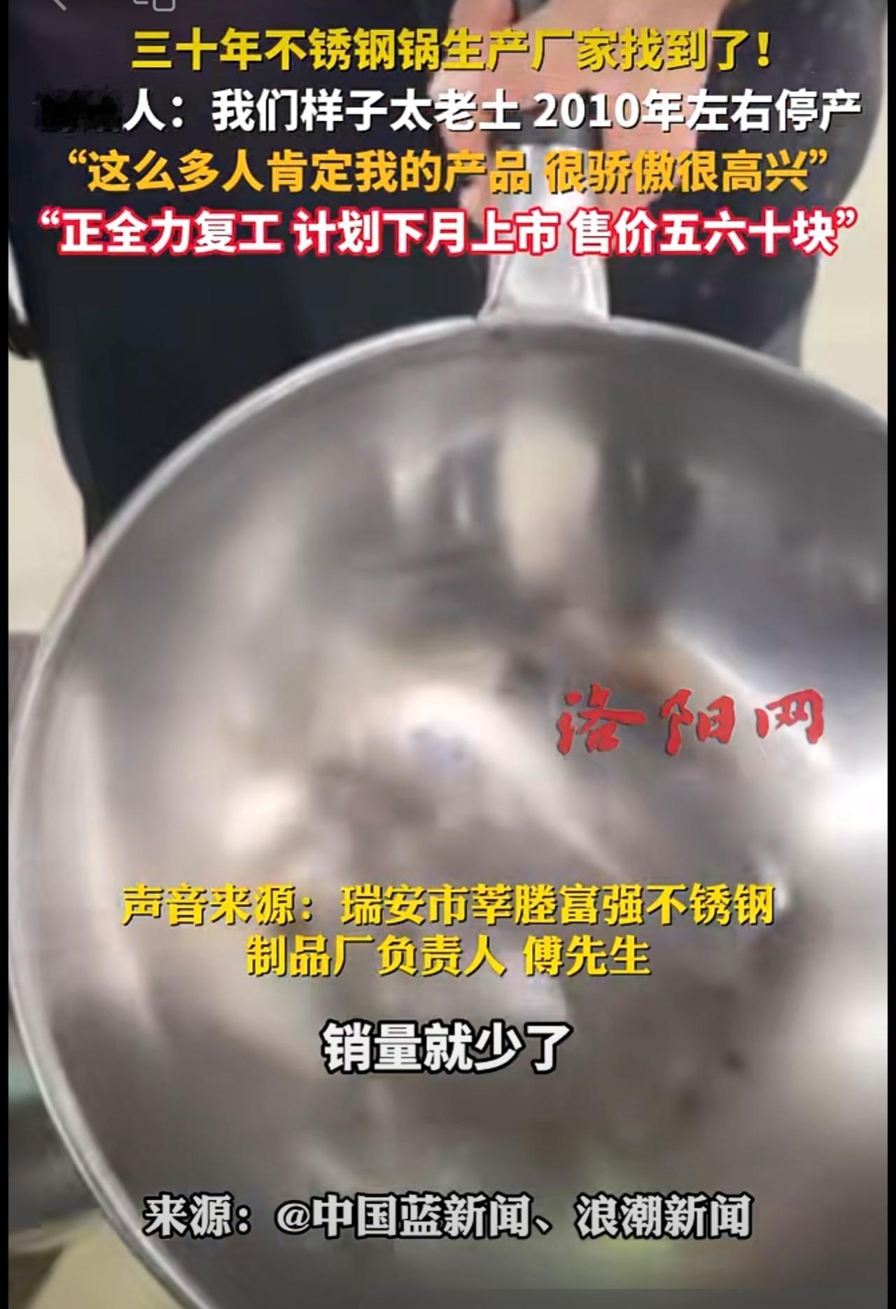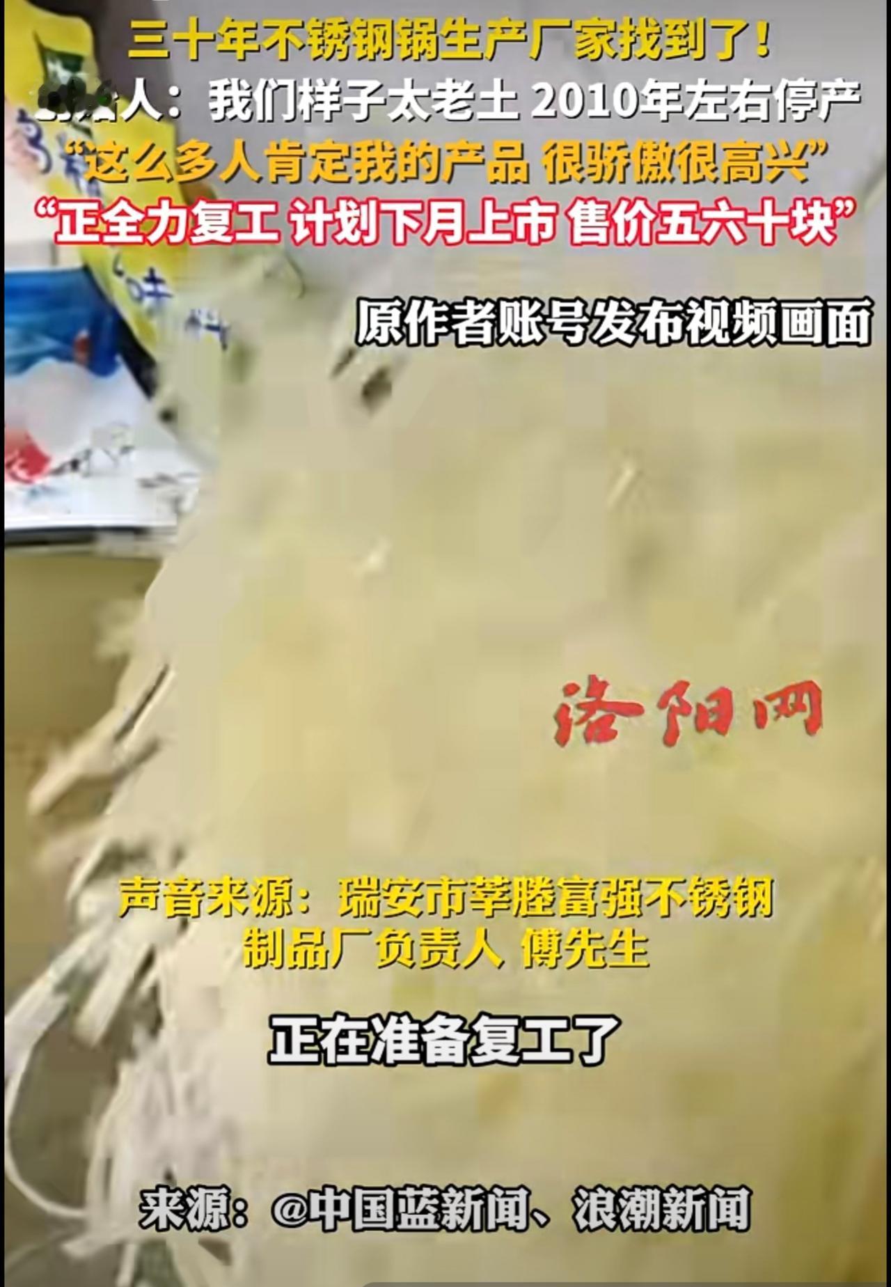 三十年不锈钢锅生产厂家找到了,创始人:我们样子太老土,2010年左右停产,“这么多人肯定我的产品,很骄傲很高兴”,“正全力复工,计划下月上市,售价五六十块”。