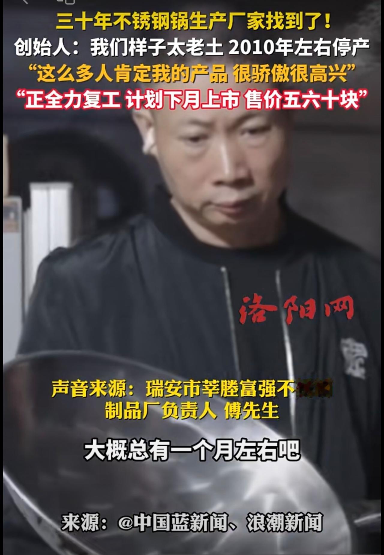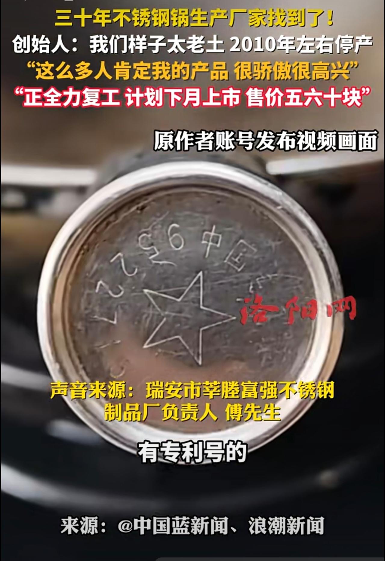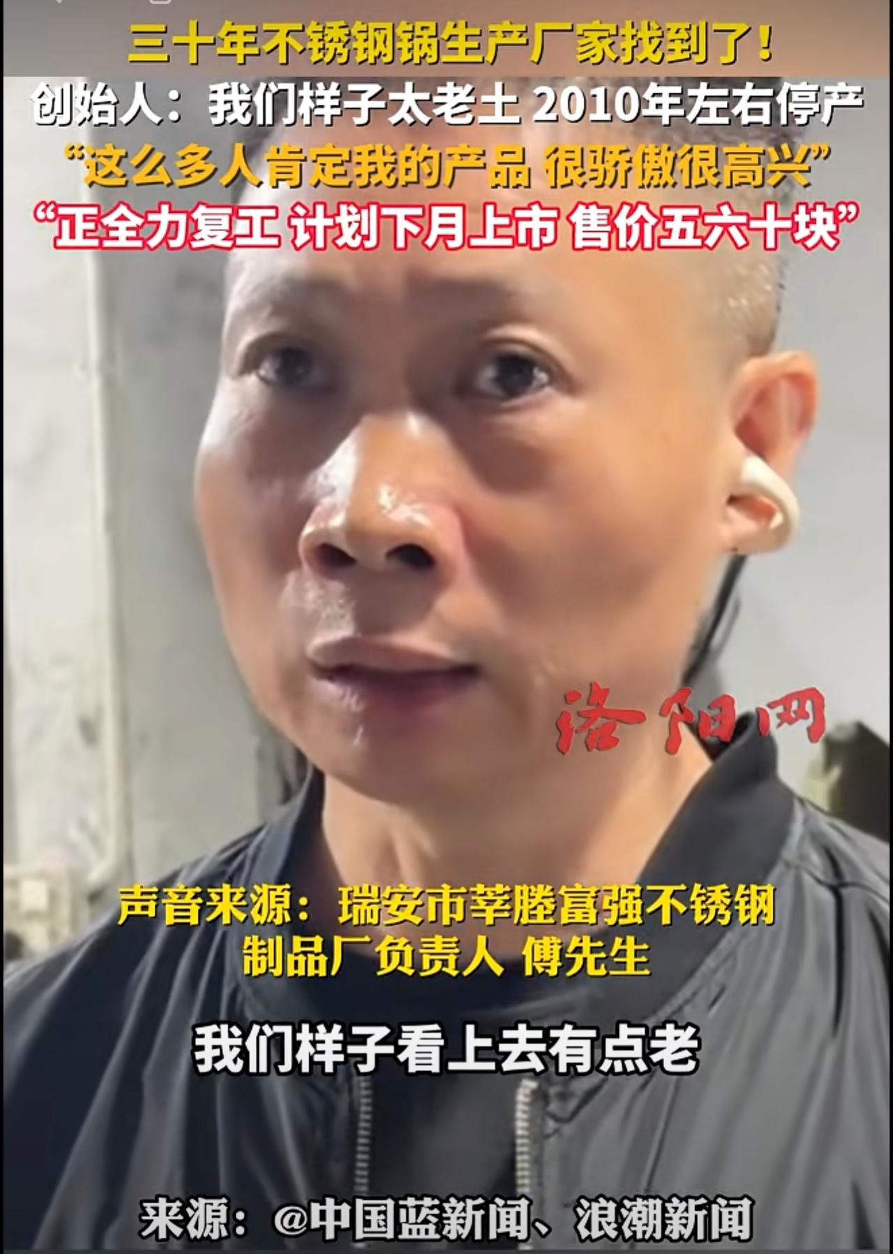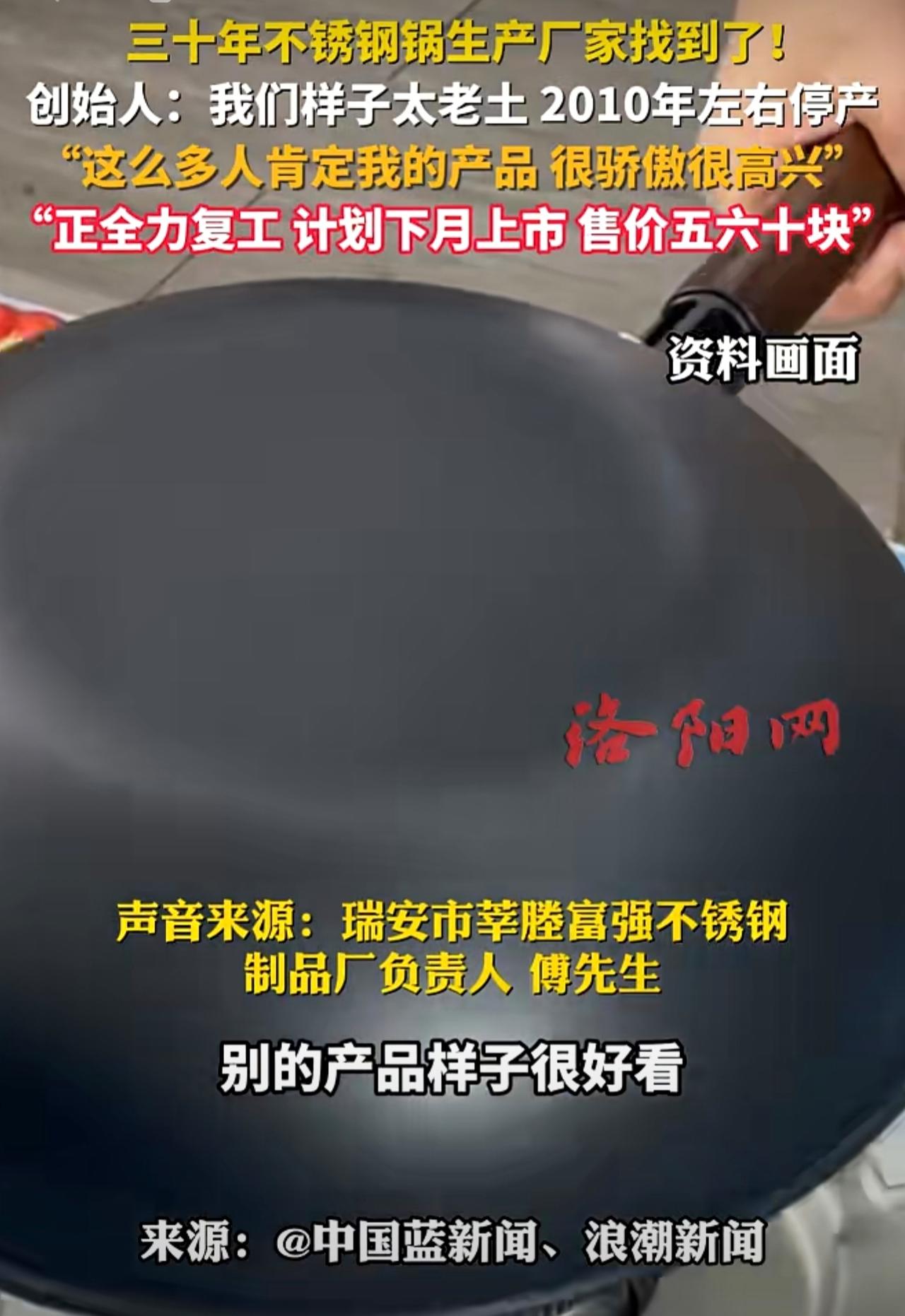 三十年不锈钢锅生产厂家找到了,创始人:我们样子太老土,2010年左右停产,“这么多人肯定我的产品,很骄傲很高兴”,“正全力复工,计划下月上市,售价五六十块”。