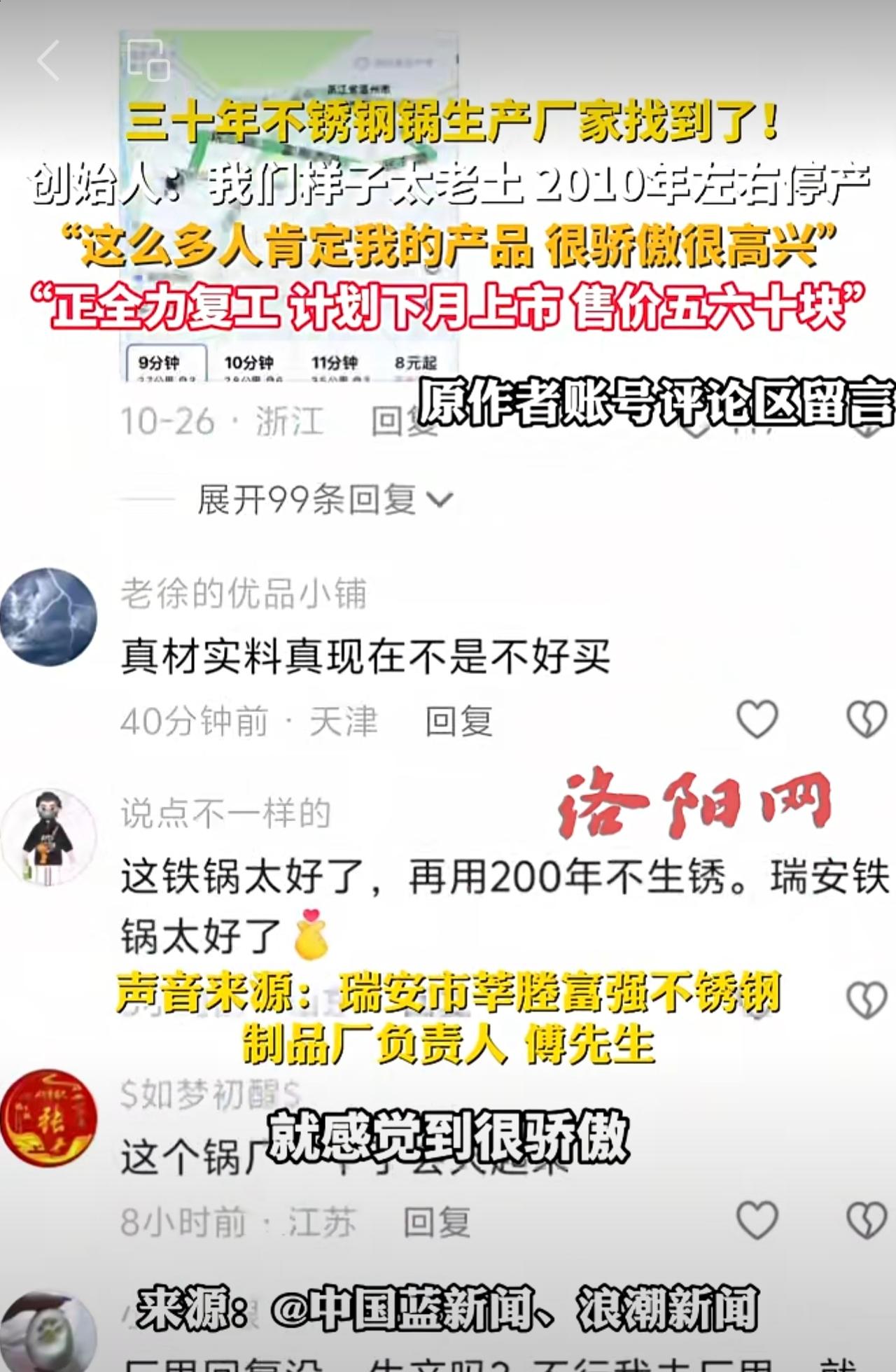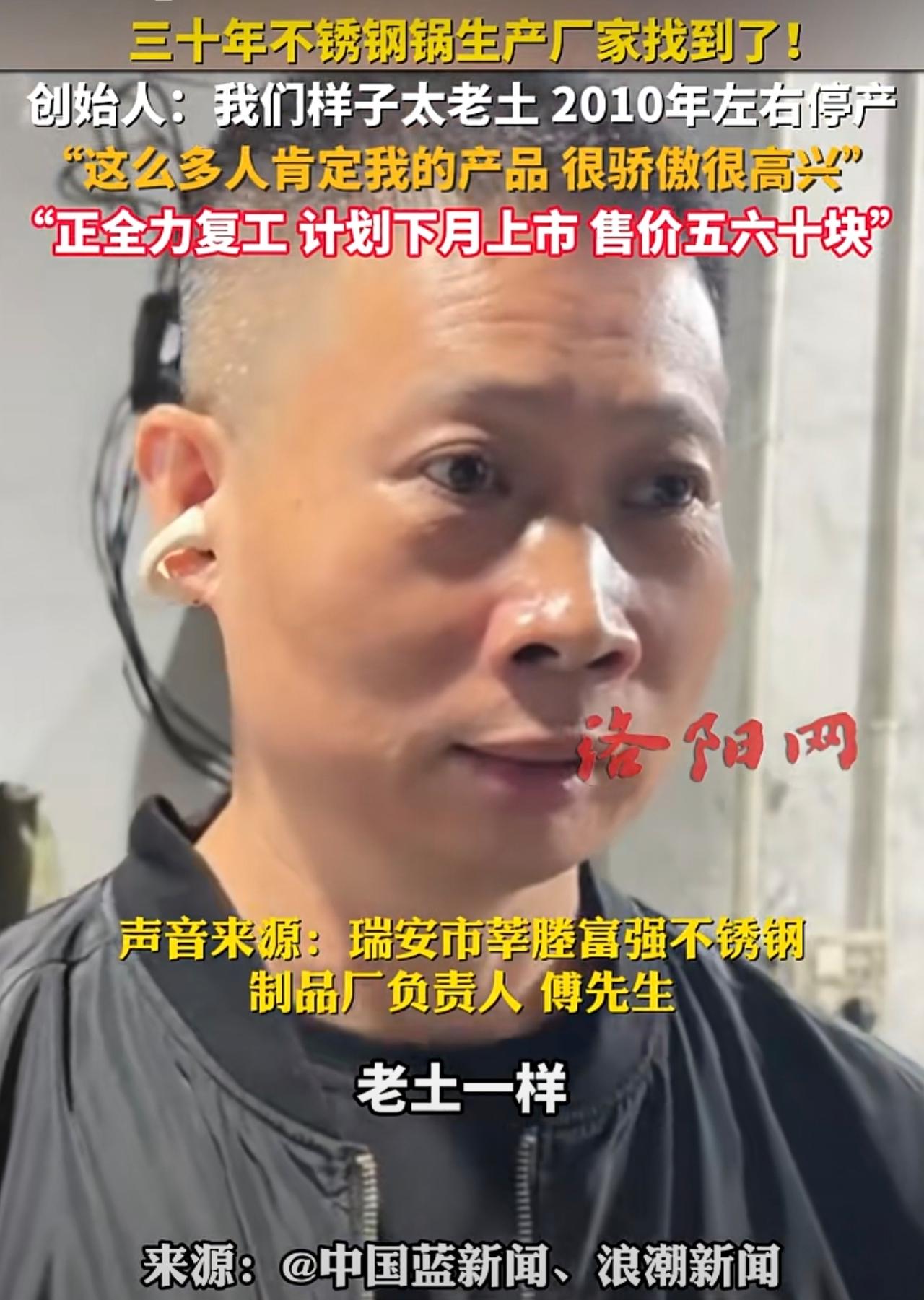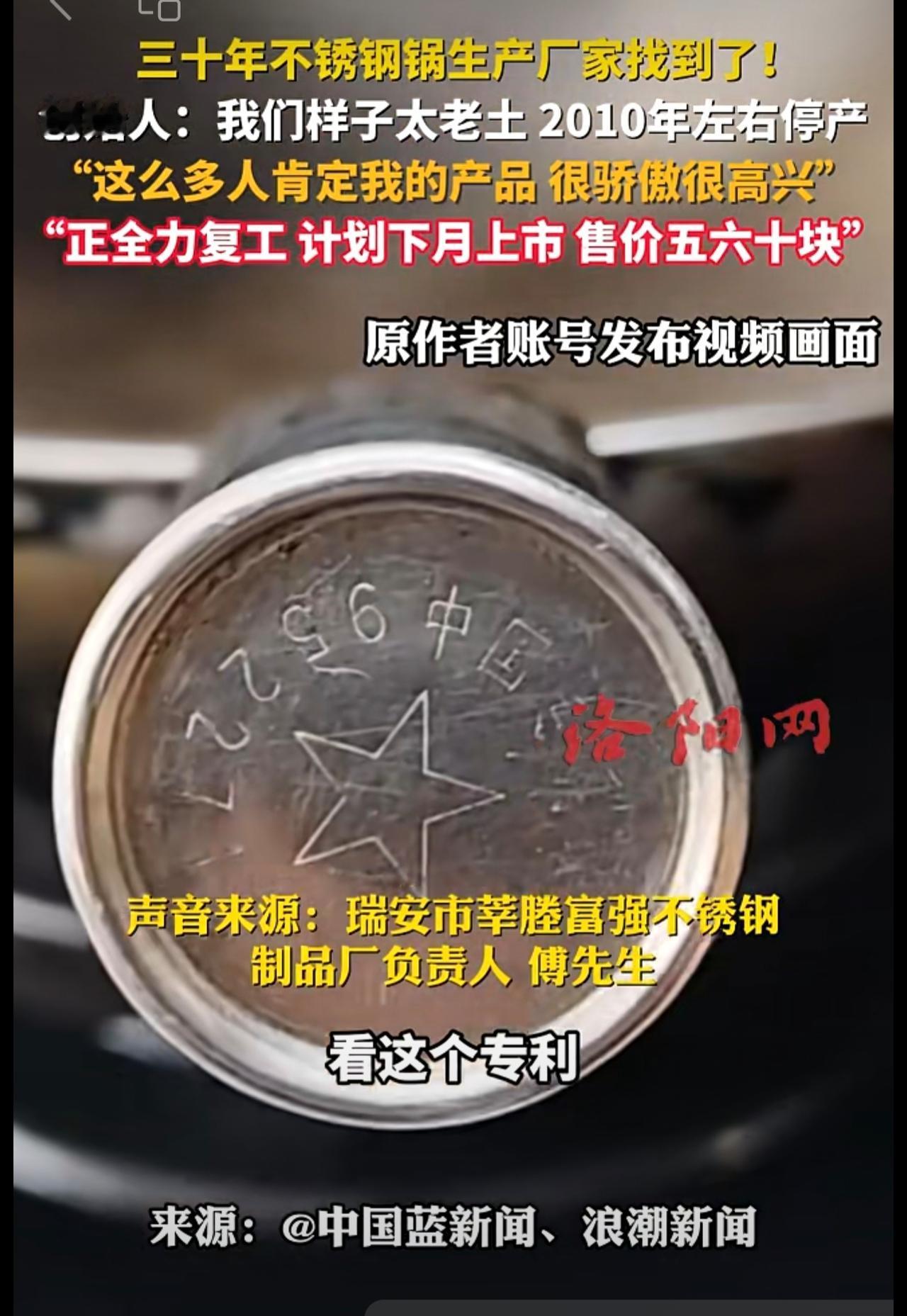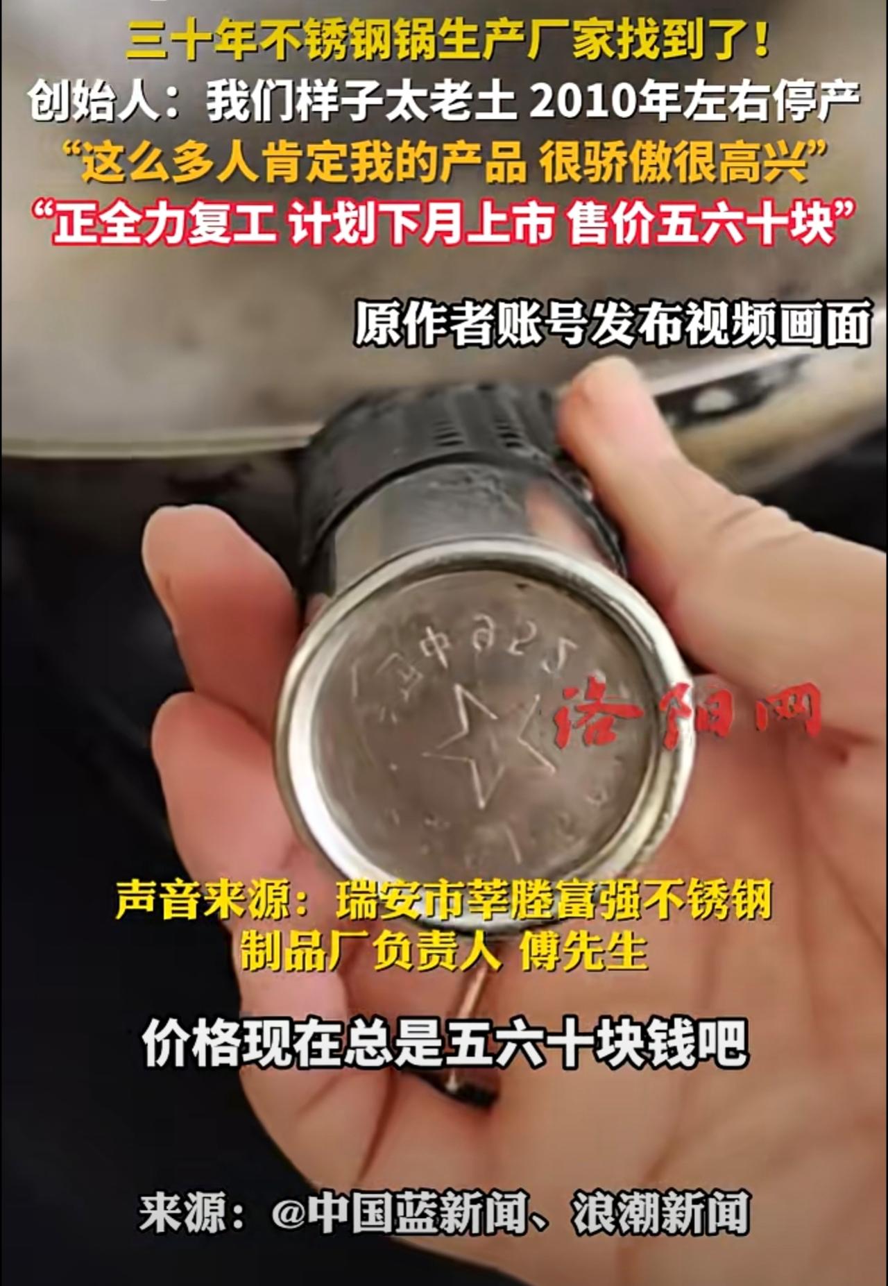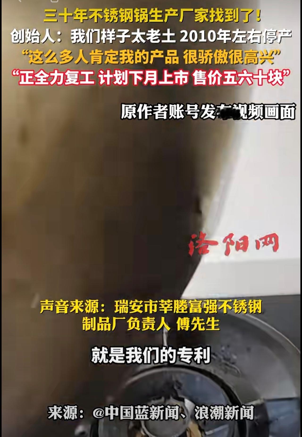 三十年不锈钢锅生产厂家找到了,创始人:我们样子太老土,2010年左右停产,“这么多人肯定我的产品,很骄傲很高兴”,“正全力复工,计划下月上市,售价五六十块”。
