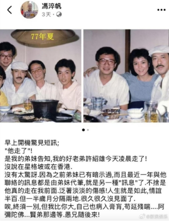 10月28日,冯淬帆曾在社交平台发文悼念刚去世的好友许绍雄(10月逝世),感慨“情谊半百,但半生分隔两地”,并留下“贤弟那边等,愚兄随后来”的寄语。三日后,此语竟成谶言。