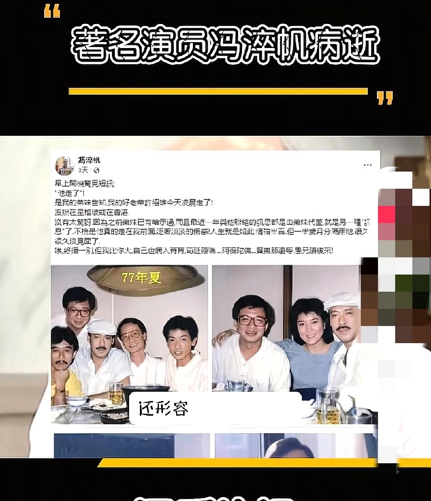 好难过 娱乐圈又失去了一位经典绿叶 81岁冯淬帆病逝!港圈“冷面笑匠”落幕,但他带给我们的喜剧精神永远留在我们心中。 你知道吗?那个活跃在7、8、90年代香港影视圈的“冷面笑匠”冯淬帆走了。从1944到2025,81年的人生里,他用一个个经典角色把喜剧演到了骨子里,带给我们无限欢乐。 他不是那种咋咋呼呼的喜剧人,却能用最冷静的表情说出最搞笑的台词,这种反差感的喜剧魅力,现在的影视圈真的很难见到了。他的离开,是港圈喜剧的一大损失。 这10天、甄志强、许绍雄、还有冯淬帆老前辈,都一个个离世,甚至有些记不住名字,看到经典影视才知道,原来是他。 缅怀前辈。你对冯淬帆哪个角色印象最深?老艺术家