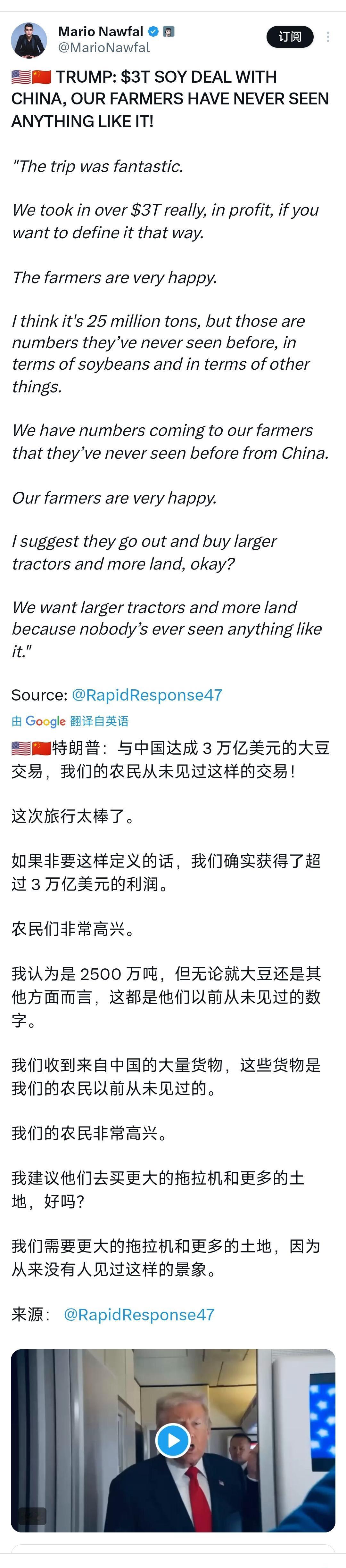 北京时间11月1日,特朗普在空军一号上对记者放话,说美中之间达成了3万亿美元的大豆交易,还说美国农民从没见过这么大的买卖,建议大家赶紧去买更大的拖拉机和更多土地。 这种说法一出,顿时引发了舆论热议,不是因为交易本身,而是这个“3万亿”的数字实在太跳脱了现实逻辑。 毕竟就算你对国际农业贸易完全不了解,但也能感觉出来,这数字听起来就不太靠谱。先说个基本常识,美国过去几十年对华大豆出口的年均值大致维持在百亿美元量级。 哪怕是中美关系最好的年份,贸易额也从未远远突破这个范围。根据美国农业部和海关的官方数据,哪怕把过去二十年的出口额全部加起来,也远远没到1万亿美元。 更别说3万亿这么夸张的说法了。所以说,特朗普的这番话,要真拿数据一比对,根本经不起推敲。说三万亿的交易额是“虚高”,那都是客气了。 其实,特朗普讲话风格一直就这样,夸张、情绪化、爱用大词,时常把愿望当现实,把口号当成绩。他无论是谈经济、外交还是疫情,经常会抛出一些“惊人之语”。 听起来气势十足,但事后一查,大多都没有实质支撑。这次说农民赚翻了,其实更像是他一贯的自我包装套路,听着热闹,但不对账本。 更重要的是,这种说法如果被误传或者未经核实地传播出去,很容易误导舆论和市场情绪,对真正从事农业生产和国际贸易的群体来说,反而是一种困扰。 说到大豆,其实它一直是中美贸易中的一个敏感产品。在2018年中美贸易摩擦最激烈的时候,中国对美大豆加征关税,美国农民确实一度受到影响。 那时候的确有很多美国农业州的选民感到焦虑,因为他们的收入对中国市场高度依赖。后来中美逐步恢复部分农产品贸易,中国也在多个场合表示愿意扩大进口,包括大豆、玉米等农产品。 但即便如此,谈判和采购都是按市场需求和价格来走的,不可能出现所谓三万亿美元的“超级订单”。如果真有这么大的单子,那还真得全球所有农民一起上,可能连地球都不够种。 再从中美贸易的整体体量来看,根据中国商务部和美国贸易代表办公室的统计,2022年中美双边贸易总额约为7600亿美元,其中包括所有商品和服务,农业只是其中的一部分。 你说单靠大豆就能达到三万亿,这不等于说美中未来几十年所有的贸易都让给了大豆产业?听上去就像是把一个玉米棒子说成了航空母舰。逻辑上根本不成立。 所以说,特朗普的说法虽然听起来热闹,但经不起任何现实数据的检验。与其说他在宣布一个真实的国际贸易成果,不如说是在用夸张的语言延续他一贯的政治风格。 对于我们来说,吃瓜可以,但也要看清瓜是不是真的长在地上。别被表面数字吓住了,三万亿这个数字,恐怕连他自己说完都不会去认真算一算。
