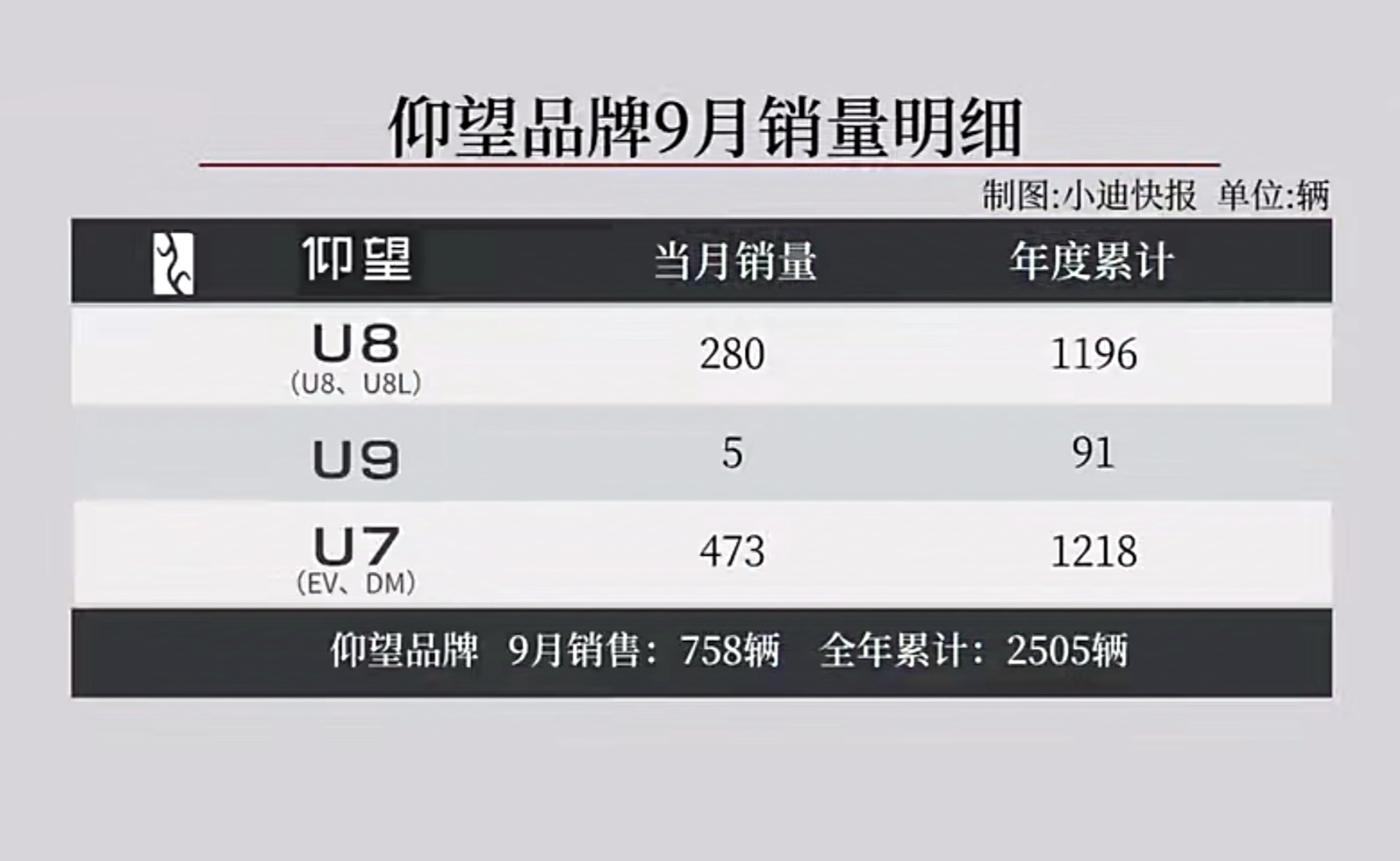 9月,168万的仰望U9,卖了5辆。 9月,109.8万的仰望U8,卖了280辆。 9月,62.8万起的仰望U7,卖了473辆。