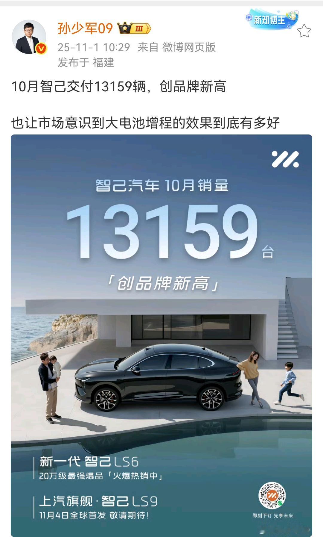孙少军:10月智己交付13159辆,创品牌新高! 也让市场意识到大电池增程的效果到底有多好,说明推出来有增程又有大电池的车辆,非常受市场的欢迎。 除了智己之外,其他的厂家也在做类似的事情,以前纯电车上才会使用的大电池,从今年开始很多车企都会陆续装载到车上。 因为有很多人有续航焦虑,哪怕发动机几乎不用,也需要有一个发动机。在充电不那么方便或自己有出行需求,车辆没有电的情况下也能随时出发。 各位是怎么看的?欢迎评论区留言。