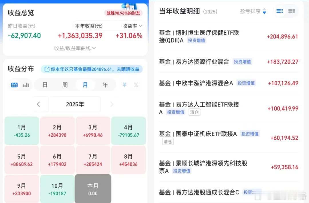 场内ETF账户与场外基金账户,再加上持仓的投顾组合的话,今年以来盈利200万左右了,算是盈利比较多的一年了。