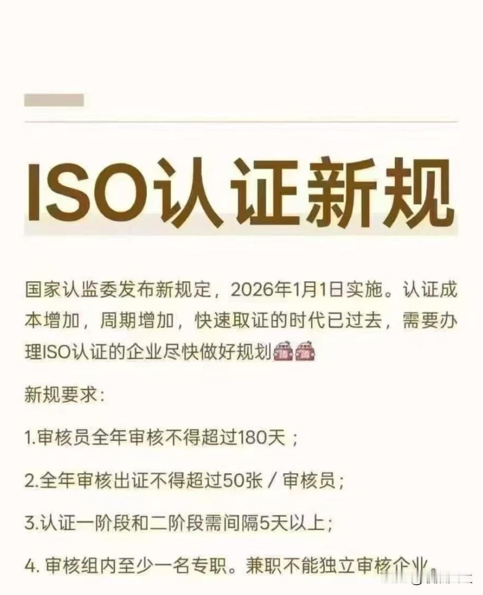 2026年1月1号ISO体系认证新规则实施更严,更慢,更贵。想办的这几个月还是过