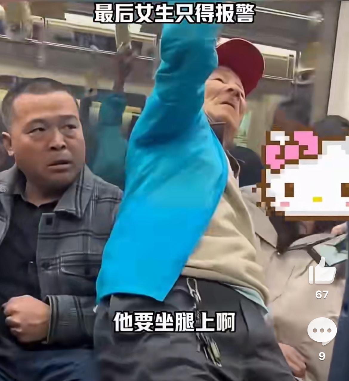 上海地铁,一蓝衣老人上车后,有人给他让座他不坐,非要坐在一个女孩子的腿上,旁边的