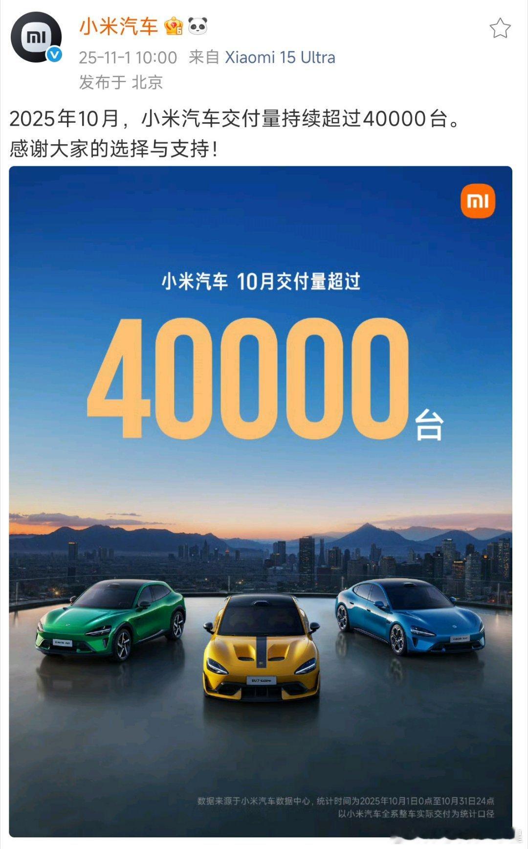 10月小米汽车交付量持续超过40000台