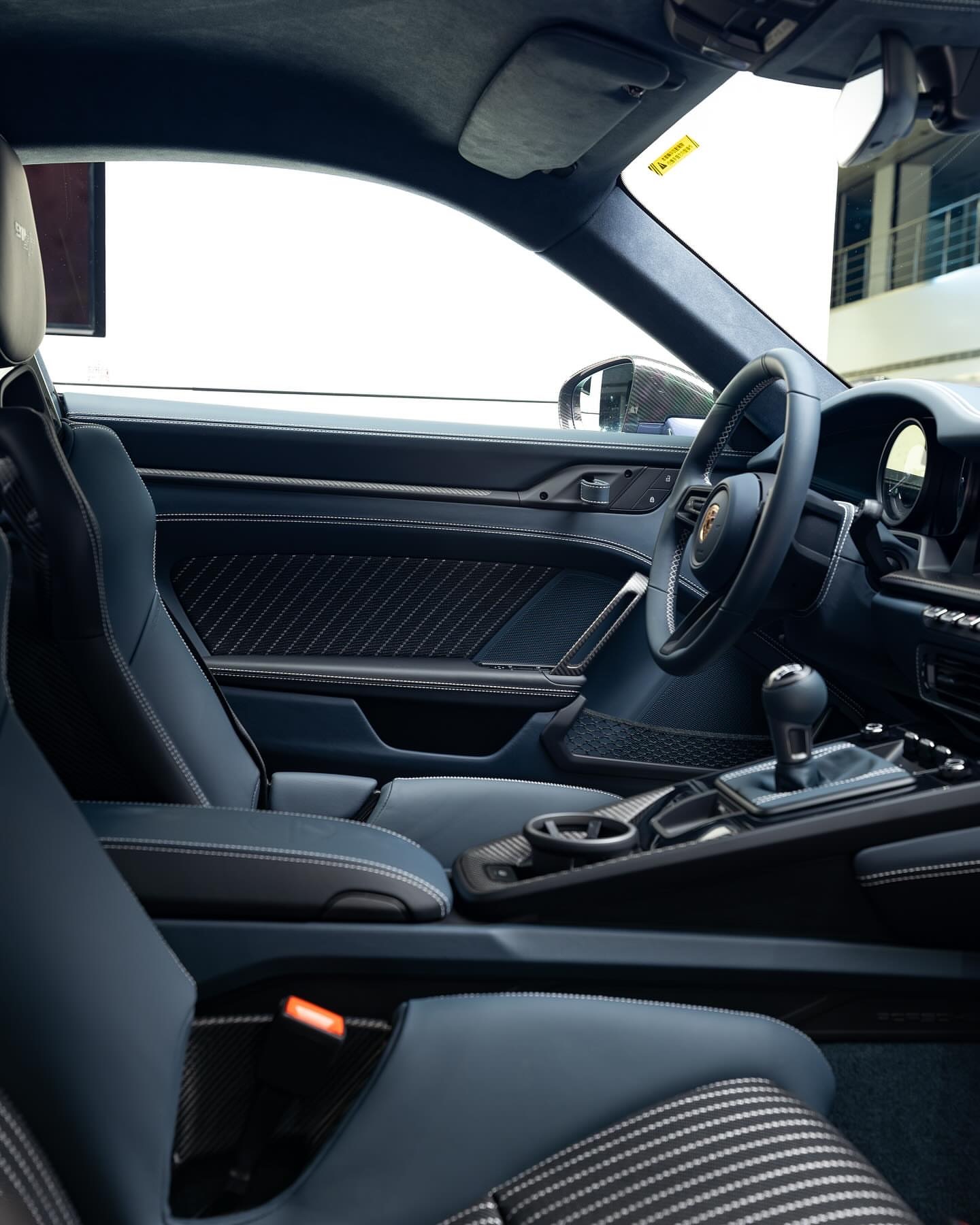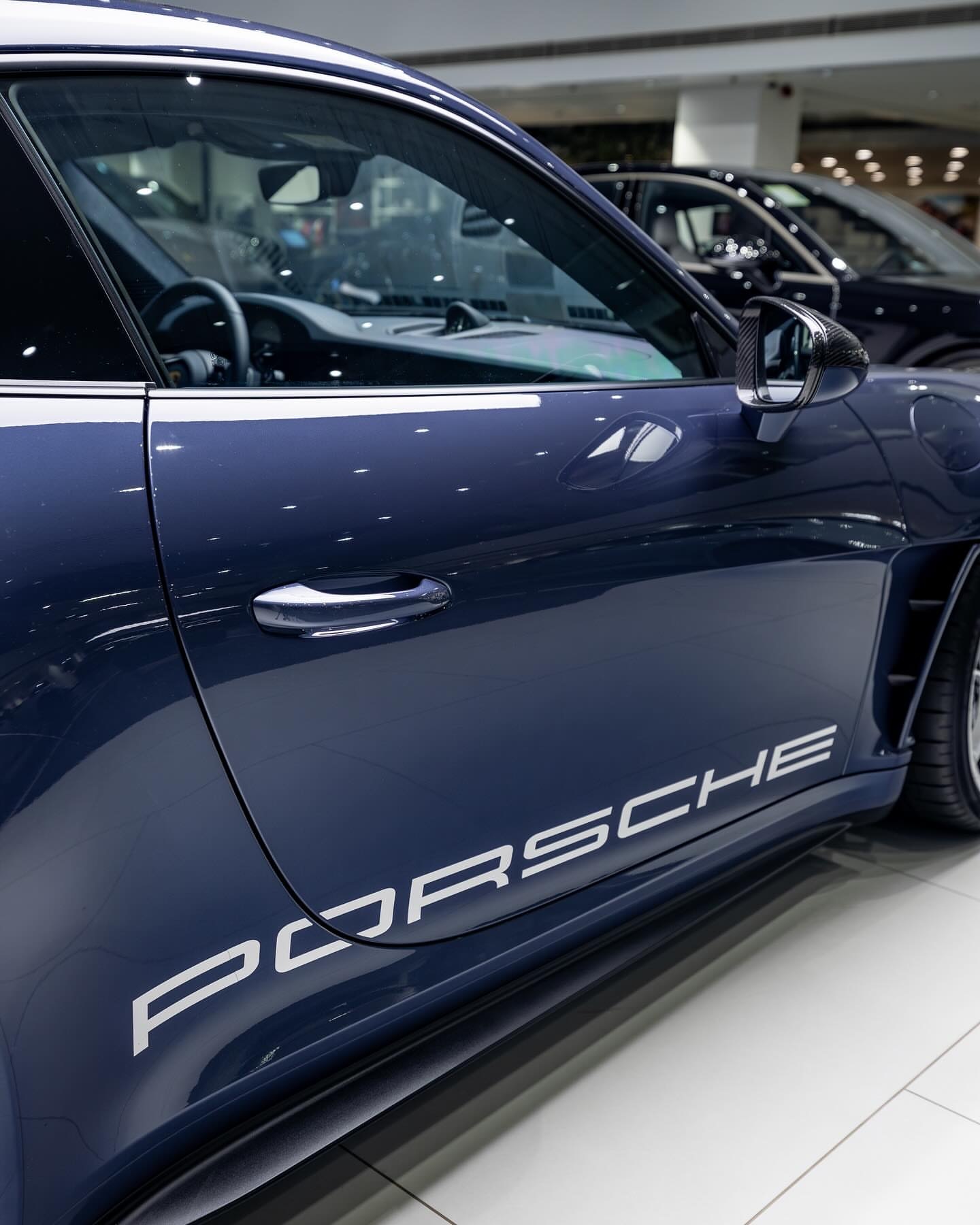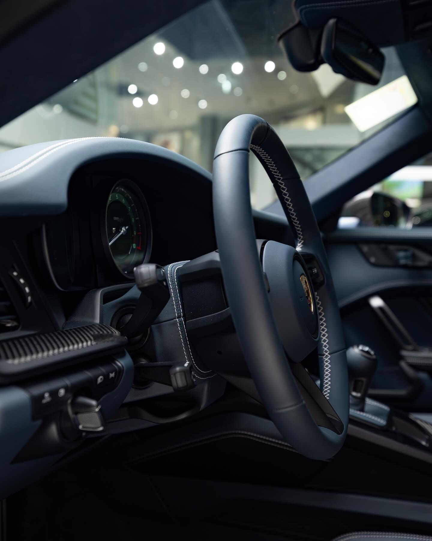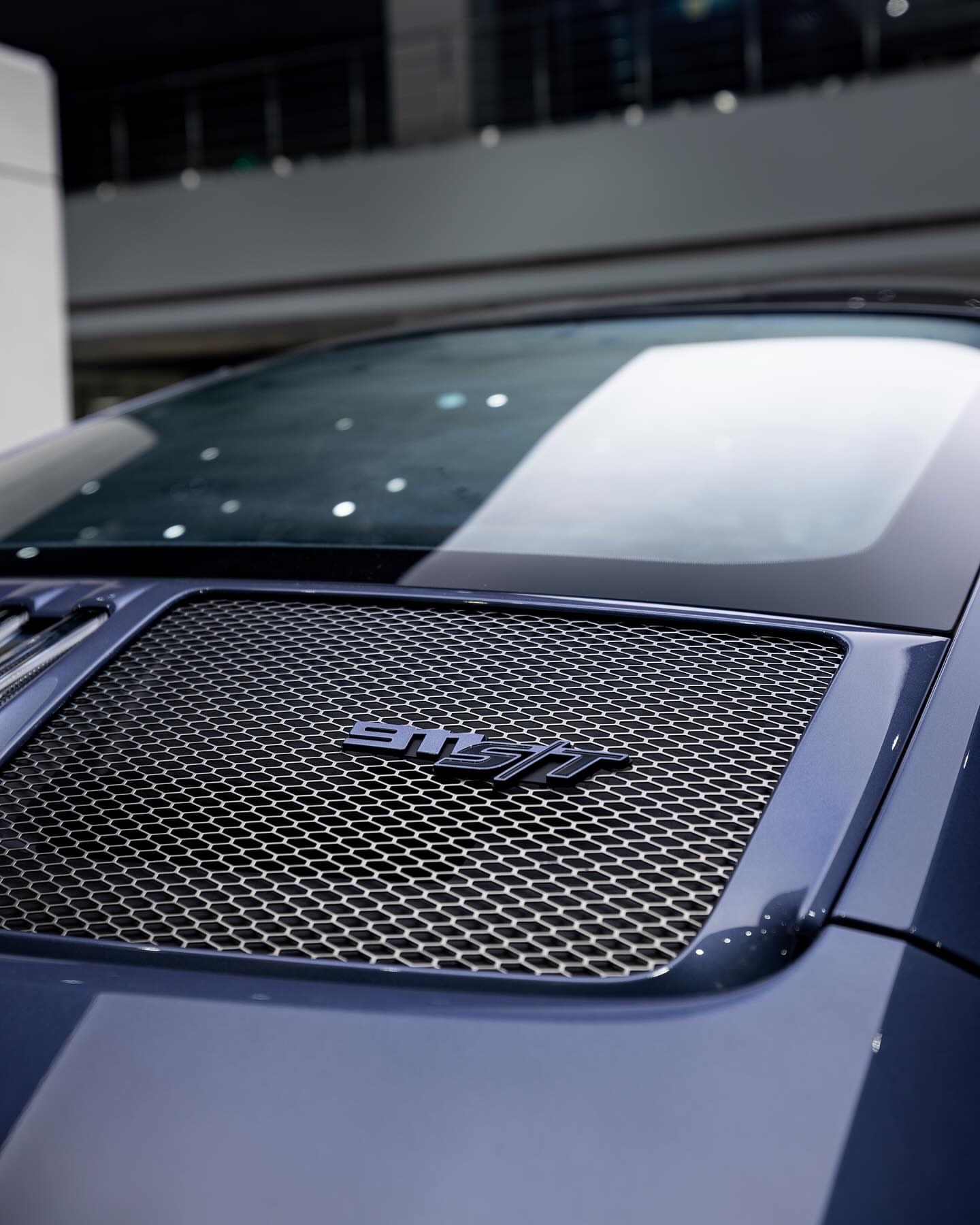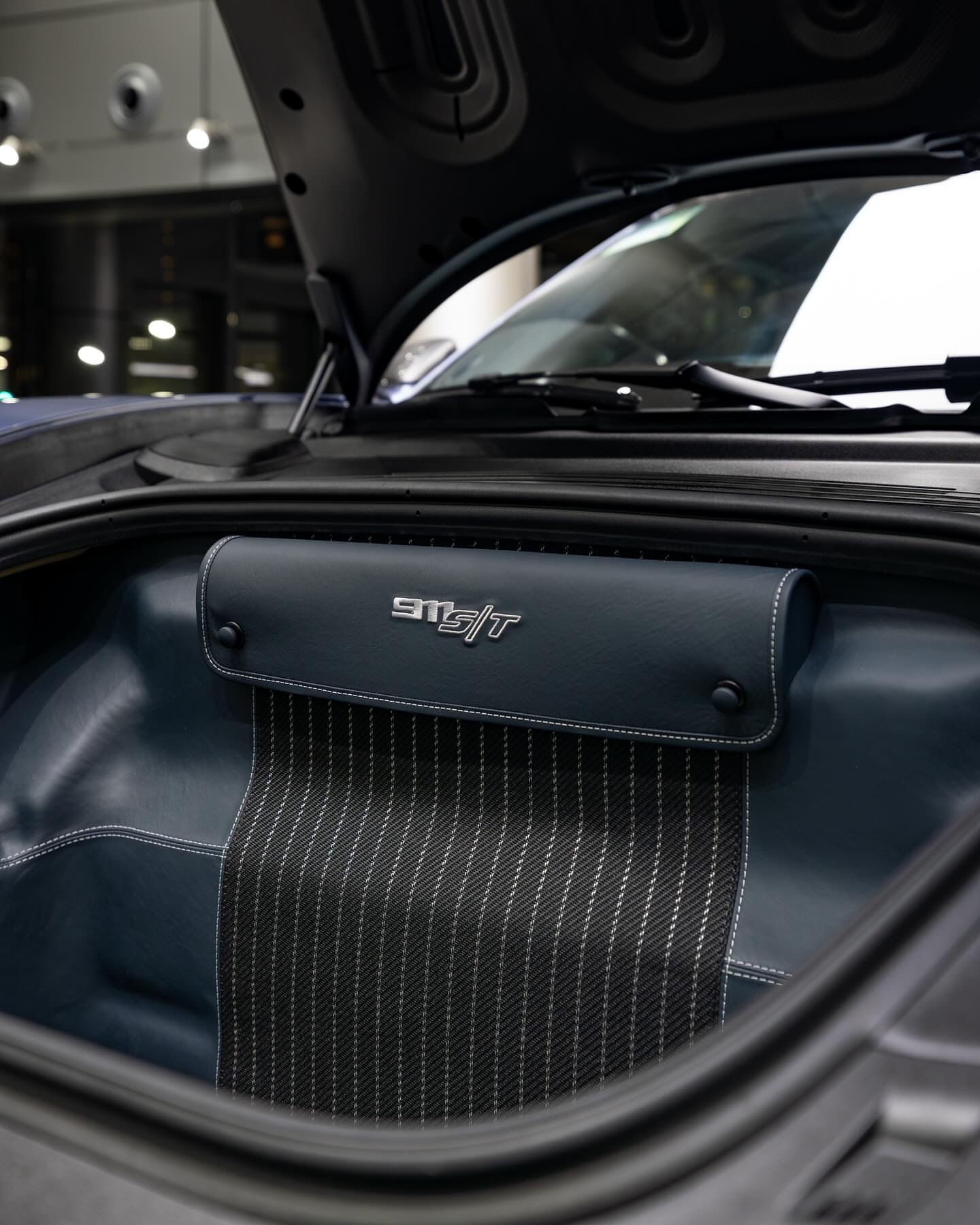 最初看到这辆车时,以为它是游艇蓝金属色,但经过仔细观察,并非如此。银色轮毂、黑色刹车卡钳的点缀,以及与车身同色的S/T标志、后网状包围和银色保时捷侧标相得益彰。