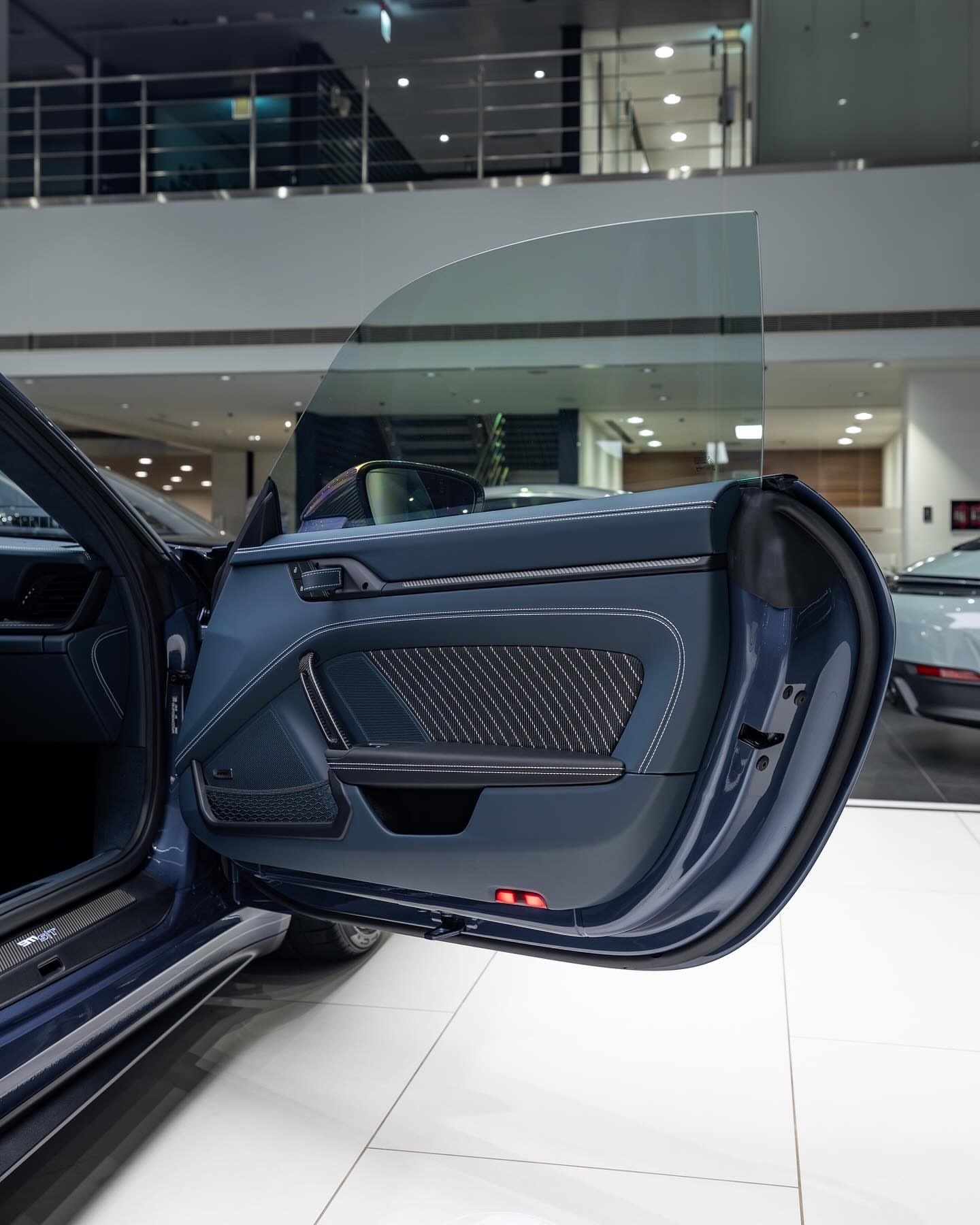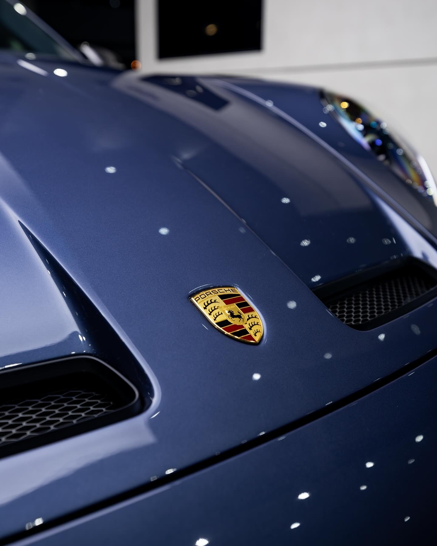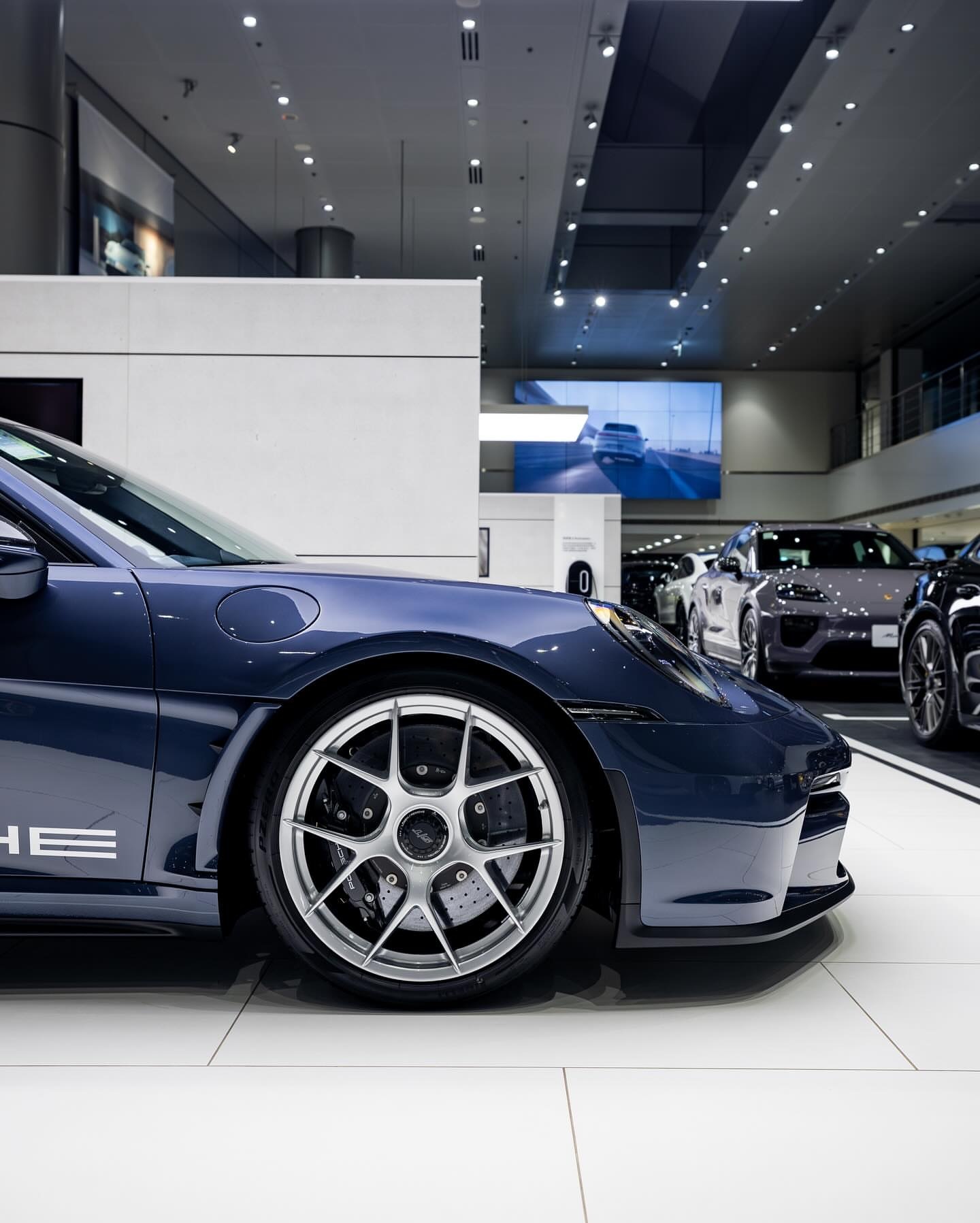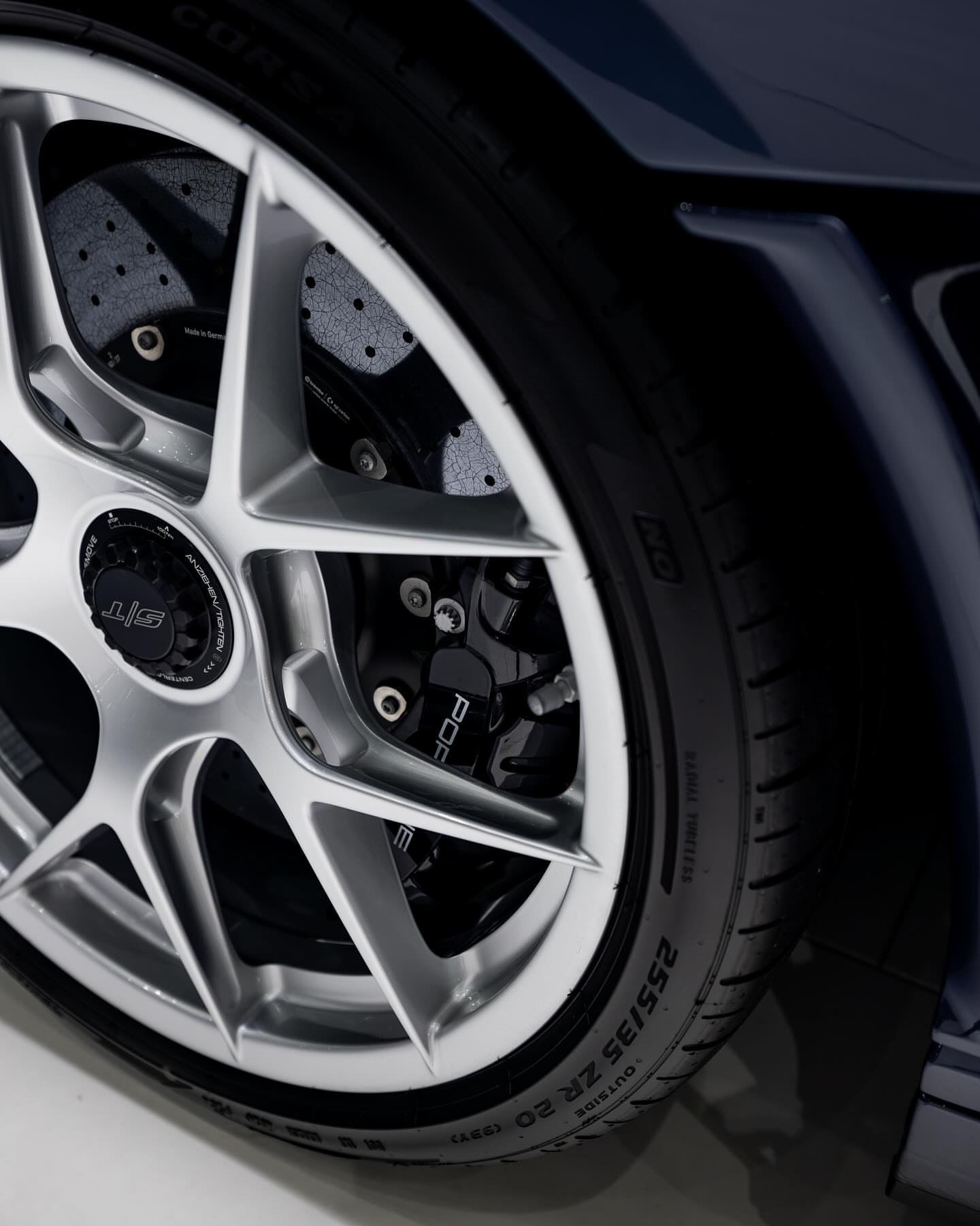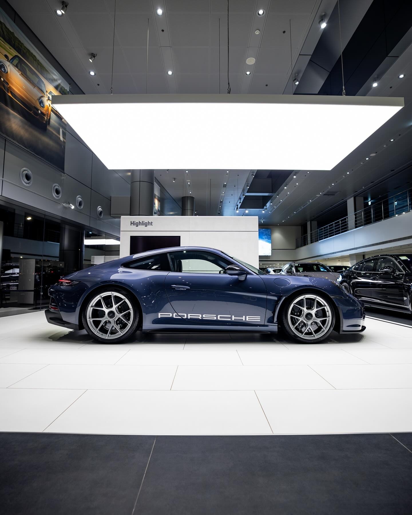 最初看到这辆车时,以为它是游艇蓝金属色,但经过仔细观察,并非如此。银色轮毂、黑色刹车卡钳的点缀,以及与车身同色的S/T标志、后网状包围和银色保时捷侧标相得益彰。