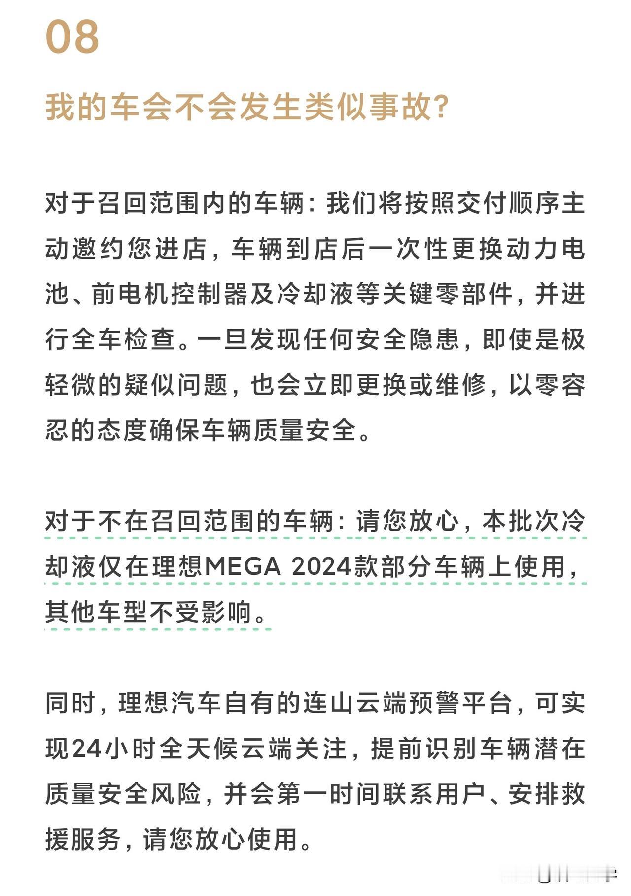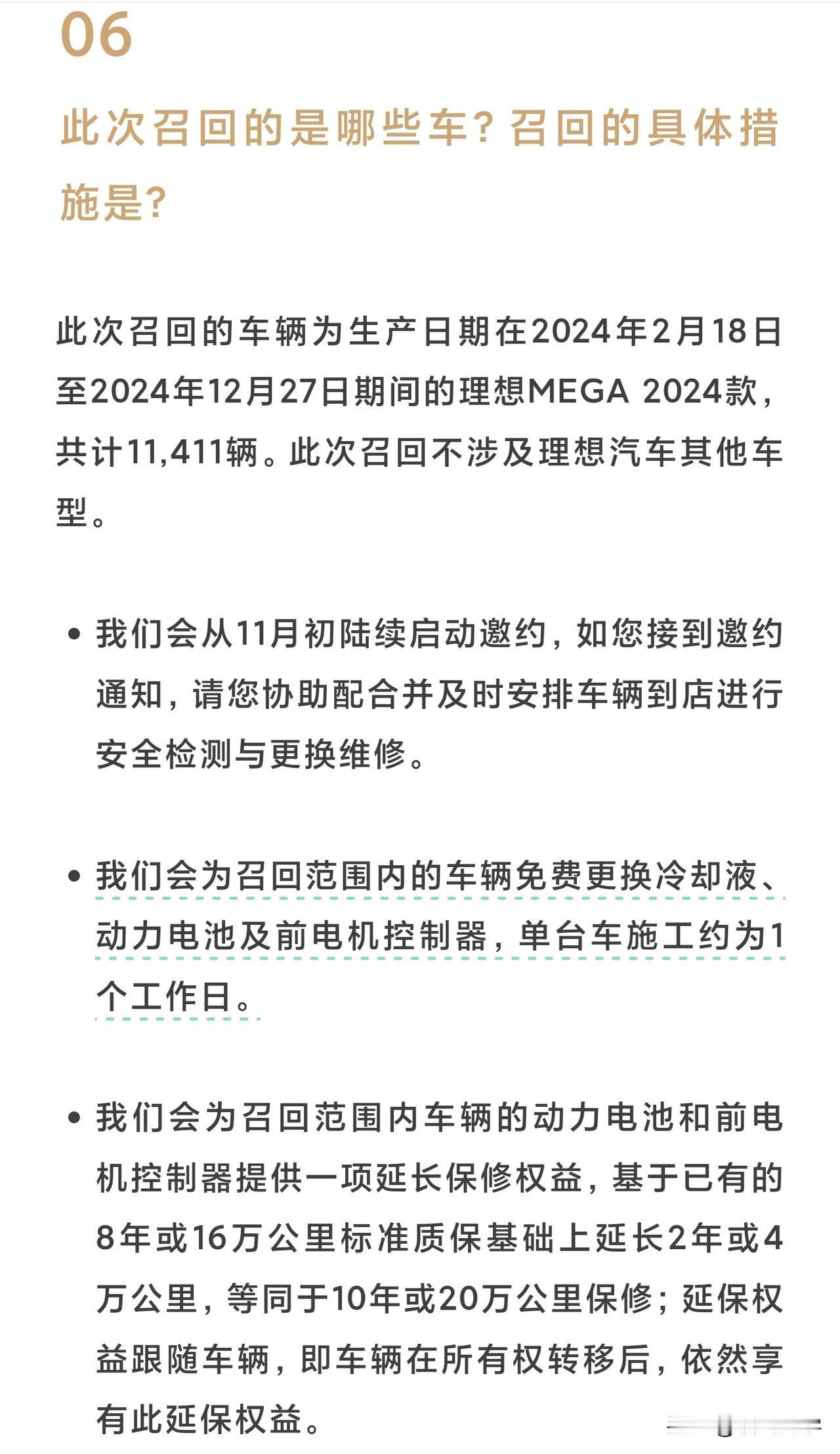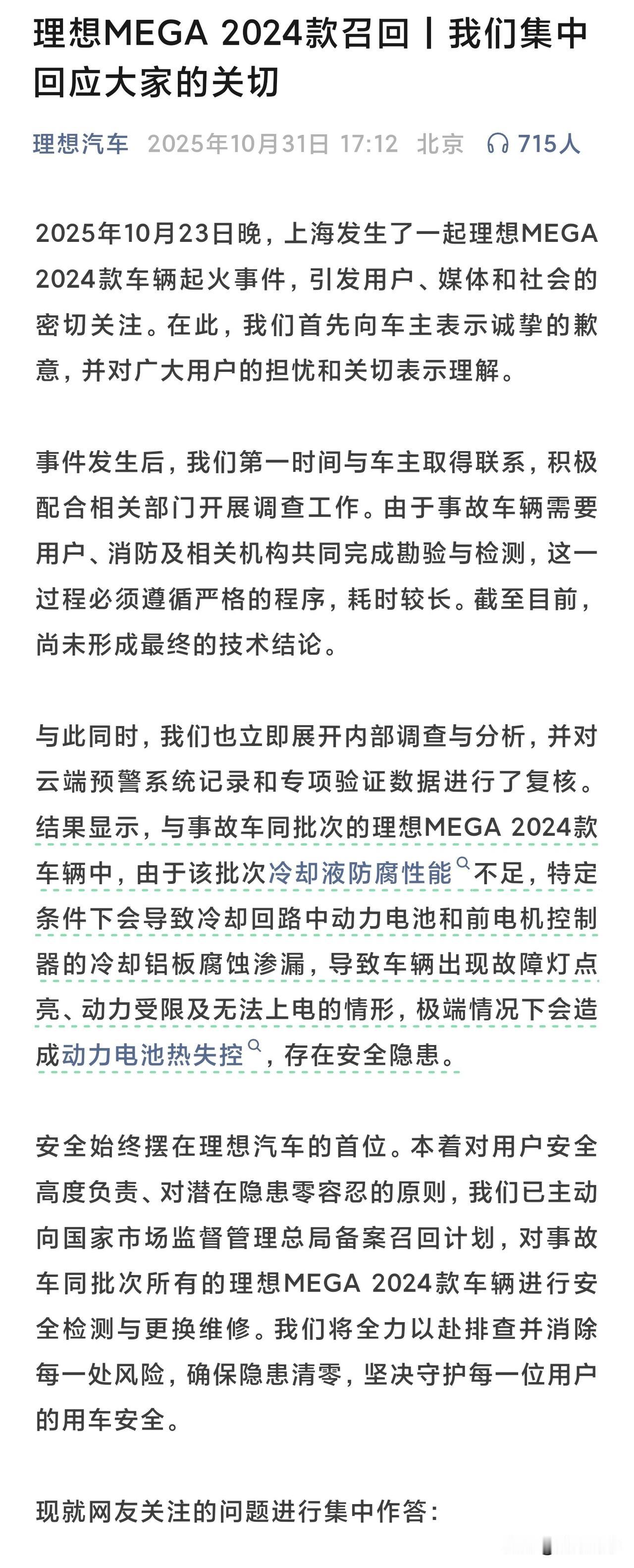 理想MEGA这款车从一发布就开始广受争议,主要还是MEGA这款车独特的外观设计,可能很多人无法接受,但是也有很多人选购这款车,因为这款车定位纯电MPV车型,拖家带口旅行和公司老总出差都很舒适和便捷。 前段时间,上海的一辆理想MEGA发生起火事故,幸好没有人员伤亡,但广大群众还是对这款车产生了质疑,为什么在没有磕碰和交通事故的情况下会起火?要回答这个问题,官网的公告出来了,执行的措施就是召回理想MEGA 2024款,共计11411辆。此次召回就是堵塞安全隐患问题,一样类似的问题不再发生,这是一家负责任车企应该有的责任和担当,值得点赞!如果想知道详细情况,请看官方集中答复的8个问题。 理想汽车 汽车理想 理想汽车 理想a6 理想one 理想One 理想汽车i8