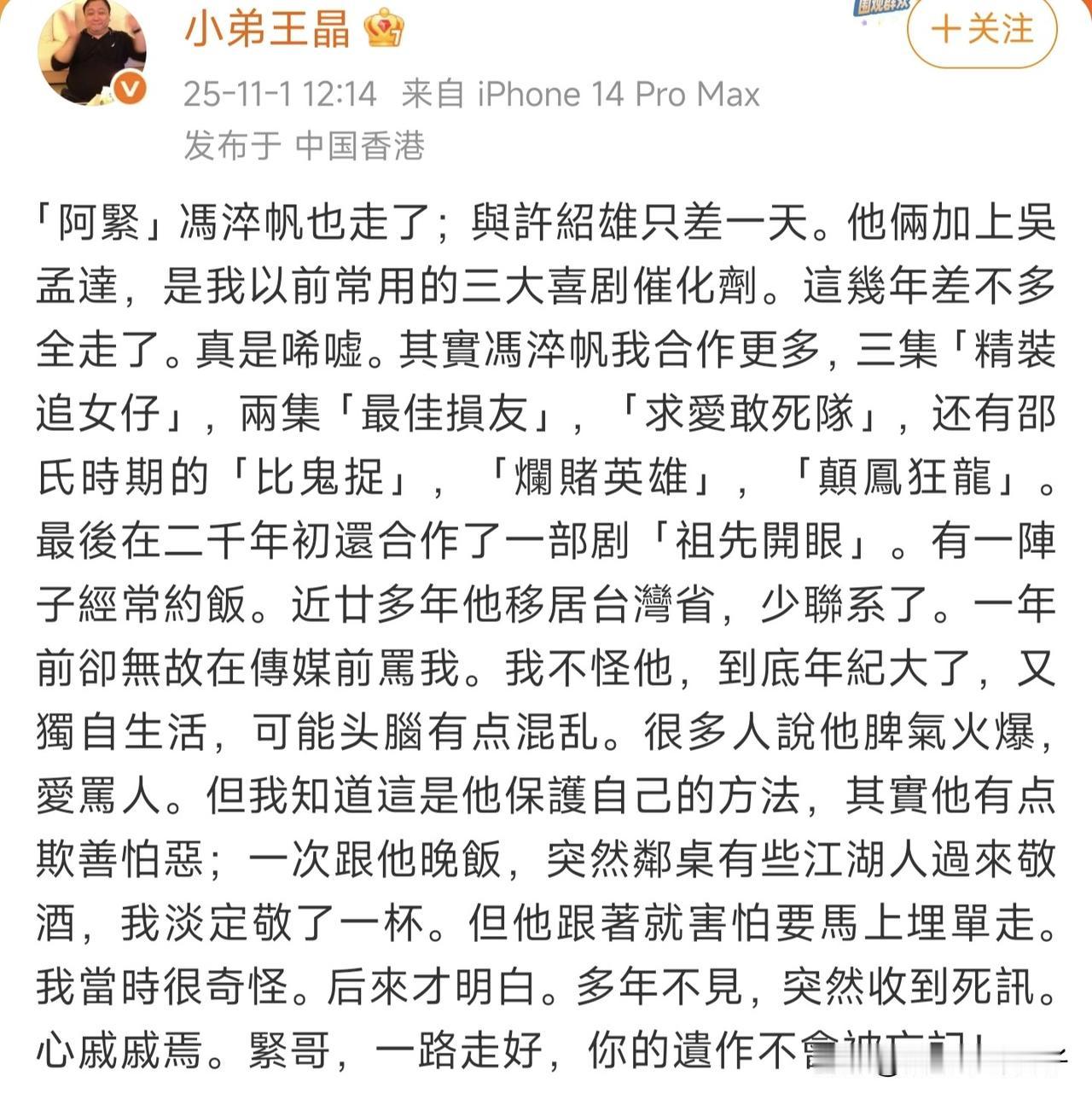 王晶发文悼念冯淬帆,一番话让人听着不太舒服! 11月1日,据媒体报道,知名演员冯淬帆去世,享年81岁! 随后,导演王晶在社交平台发文悼念,内容前半部分,感叹曾经合作的三位演员:吴孟达、许绍雄、冯淬帆全都走了,坦言非常的唏嘘。 触景生情,人之常情,说明王导也是重感情的人。 然而,下半部分内容,说实话,看完让人觉得不太舒服。 王晶再次提到两人的恩怨,并表示不怪冯淬帆,然而,用“欺善怕恶”来形容逝者,未免不太妥当吧! 当初,冯淬帆当着媒体痛骂王导,王晶也发文回怼了,关系直接闹掰。 这种情况下,王晶还能发文悼念,确实没想到,必须点赞。 逝者已矣!一切恩怨都随风飘散,相信王晶也是一个心胸宽广的人,或许说话的方式有点让人觉得不太舒服,仅此而已!