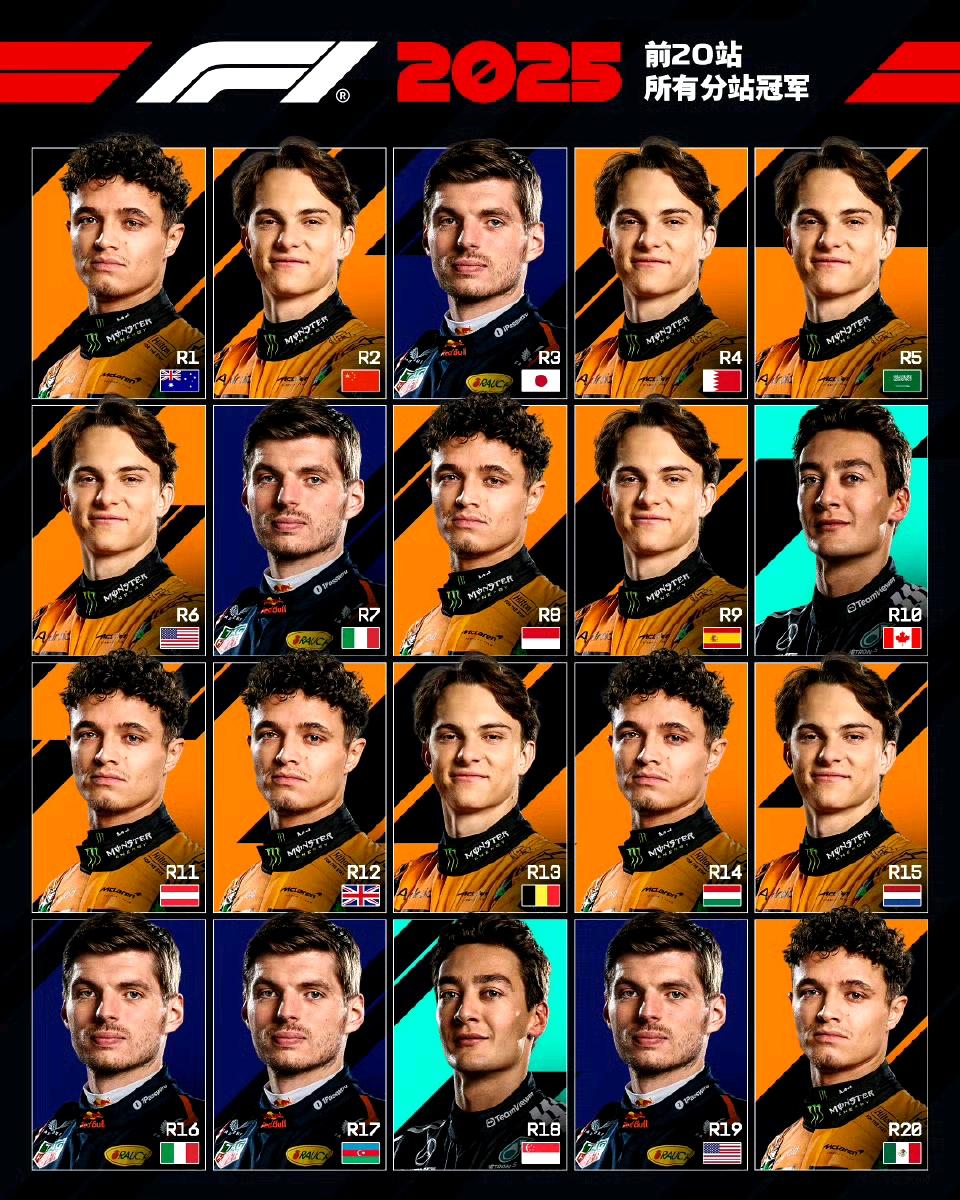 2025F1前20场分站冠军一览图,法拉利未拿一个冠军却能排名第二,更奇葩的是汉