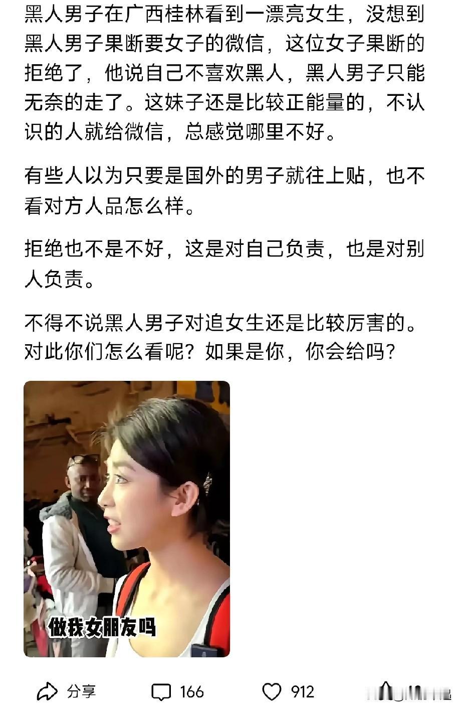 刷到个微头条!有个黑人小哥瞅见一漂亮姑娘,那热情劲儿“噌”就上来了,直接就冲上去要加微信。 结果呢,姑娘特别干脆,直接摆手拒绝,说自己对黑人没啥感觉。这小哥碰了一鼻子灰,只能垂头丧气地走了。 现在有些人啊,一看到外国面孔就往上贴,也不管对方到底啥样。要我说,拒绝陌生异性要联系方式,这太正常了,既保护了自己,也不耽误别人,同时也为这位小姐姐点赞。 话说回来,这黑人小哥追女生的勇气倒是挺足。各位读者,要是你们遇到这种情况,会给微信不?欢迎在评论区聊聊。