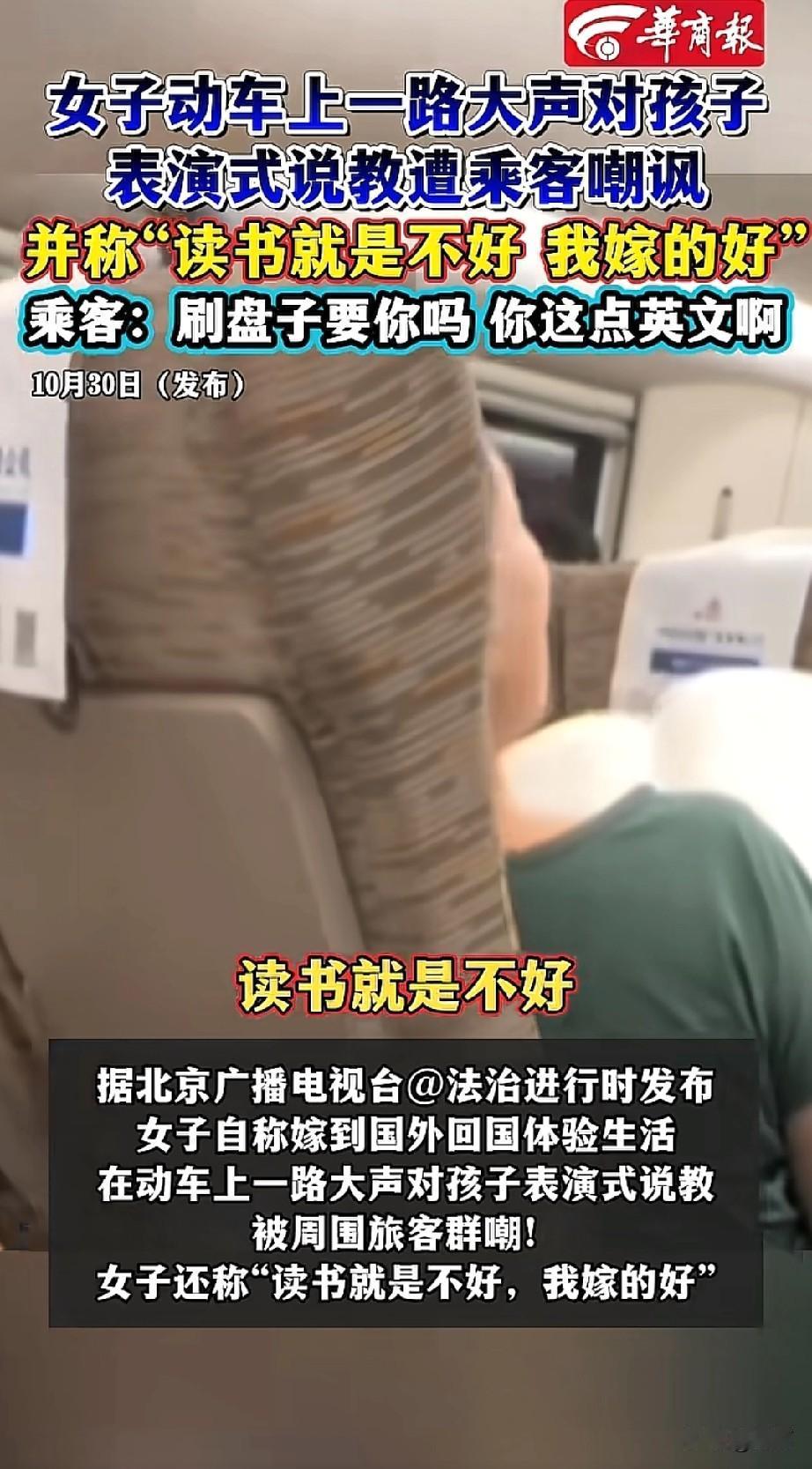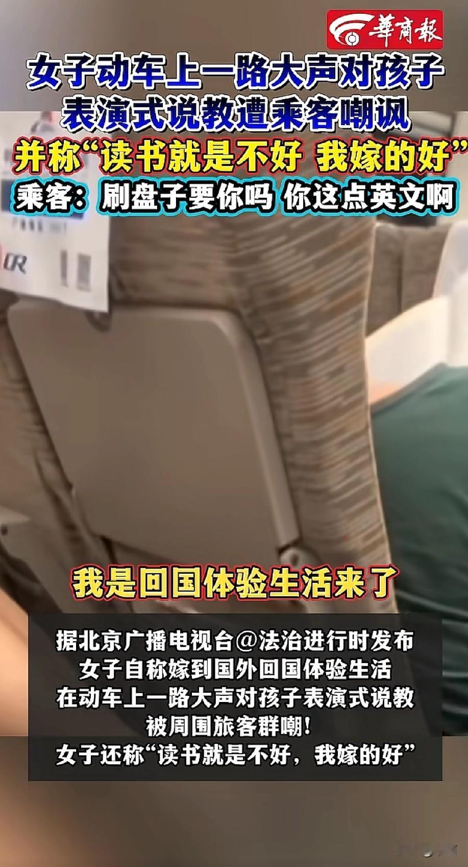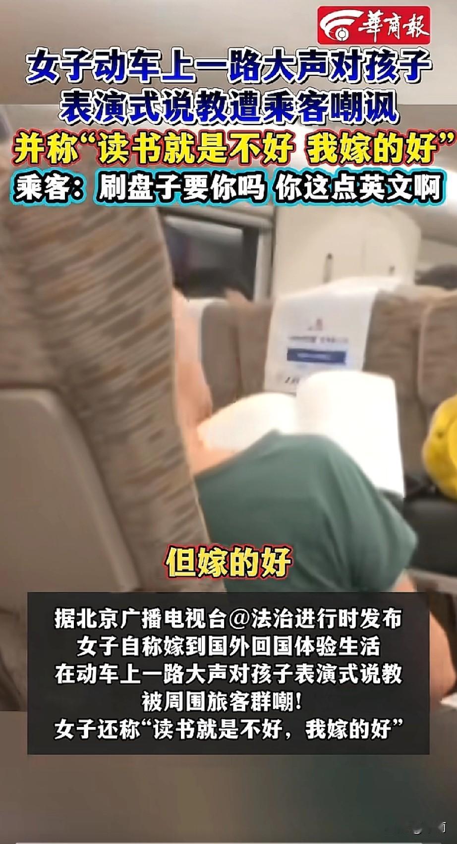 近日有网友拍高铁上一幕,一女子自称嫁去外国,大声对孩子说“读书不好,但我嫁得好”,还炫耀挣美金换人民币有优越感。旁边乘客听不下去怒怼,质疑她英文水平连刷盘子都不够,提议比雅思或四级,女子当场语塞。 这事引发不少吐槽,家长的价值观直接影响孩子。“嫁得好”或许是运气,但读书带来的独立和底气,是任何人拿不走的。公共场合说这种话,既误导孩子,也显得没格局。 靠婚姻依附他人终究不踏实,自己有学识有能力,才能过得更硬气。教育孩子该传递正向观念,读书不是唯一出路,却是最稳的出路,别让错误想法耽误孩子成长。