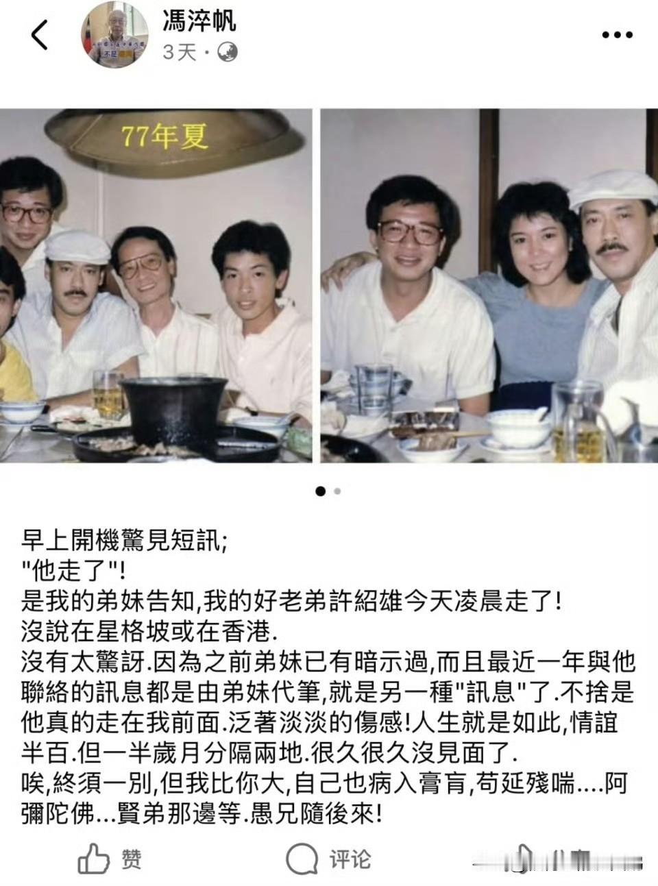 #著名演员冯淬帆去世# 《最佳损友》又走一位。 很喜欢他一本正经搞笑的样子 感谢他曾带给我们的欢乐,一路走好[蜡烛][蜡烛] 据媒体报道,香港著名演员、导演冯淬帆于2025年10月31日晚在台湾省去世,享年81岁。冯淬帆活跃于70-90年代香港影视圈,以《五福星》系列“犀牛皮”、《精装追女仔》“刘定坚”《最佳损友》“牛精帆”等喜剧角色闻名,被称为“幽默祖师”。