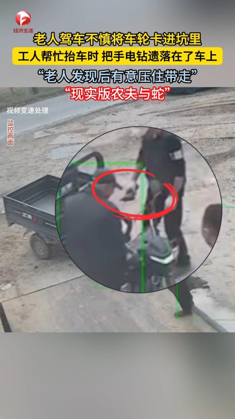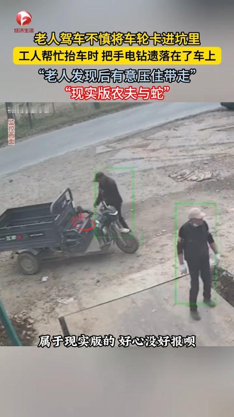 “真是白眼狼!”10月31日,河南商丘,一老人骑三轮车时,车轮不慎卡进坑里,由于自己抬不动,他就喊人来帮忙,一名工人抬车时,顺手将电钻放在了车座上,结果将车子抬出来后,老人一屁股坐在电钻上骑车就走了![得意] 几位工人师傅正在路边施工,看见一位老人的三轮车卡进了路面的坑里,他们放下手里的活儿就上前帮忙,有人顺手把电钻放在了三轮车座位上,几个人合力把车抬了出来。 老人道谢离开后,工人们便回去继续工作,可那位放工具的小伙子发现电钻不见了,调取监控才发现,老人离开前发现了车座上的电钻,但他直接坐上去,带着工具骑车离开了。 这把电钻价值两百多元,对工人来说是日常干活的必需品,不少网友感叹:好心帮忙,怎么反倒被顺走了工具? 助人为乐本是发自内心的善举,那种帮助他人后的踏实感,比任何回报都珍贵,可当善意屡屡被辜负,难免会让人在下次伸出援手时多一分犹豫。 帮助他人时要有基本的防范意识,如果那位工人把电钻放在视线范围内,或许就能避免这样的尴尬,在施以援手后,可以多停留片刻,确认情况稳定再离开,这些小小的举动,并不会减损善意的温度。 我们在帮助他人时,既要保持热忱,也要学会保护自己,比如帮忙看管物品时,可以请旁人做个见证;贵重物品尽量随身携带;在公共场所求助时,可以请工作人员协助。 这些方法既不伤和气,又能避免不必要的误会,我们都希望善良不被利用,让互助真正成为温暖人心的力量。 刷到这条“工人好心帮老人抬车,反被顺走电钻”的新闻,可把大伙儿给看郁闷了,评论区直接就炸了锅,各种声音都有。 “心疼工人,太寒心了。” “看完心里真不是滋味,人家工人师傅是实心实意来帮忙,满手灰都没顾上拍,结果换来个这?” “这哪是丢了个电钻,这是把热心人的一颗好心给伤透了。” “这种事儿多了,以后谁还敢轻易伸手帮人?万一帮了忙,还得先把自己的东西看紧,那味道就全变了。” “这和‘农夫与蛇’的故事简直一模一样,这是‘恩将仇报’。” “会不会是老人年纪大了,一时糊涂,或者想着先帮保管一下,结果又忘了联系?” “再健忘,坐上去硌得慌总能感觉到吧?骑走了就没想起来?” “无论什么理由,事后不归还,于情于理都说不过去。” “别让个别人的行为凉了所有人的心。” “咱们不能因为碰上一两个这样的,就否定所有需要帮助的人,世上还是好人多,该帮还得帮,但帮的时候自己多留个心眼,保护好自己的东西不丢人。” 如果你是这个工人,经历了这么一遭,下次再遇到类似有人需要帮忙的情况,你还会毫不犹豫地伸手吗?是会选择继续帮助,但做好防护?来评论区聊聊你的真实想法吧。 信源:AHTV第一时间