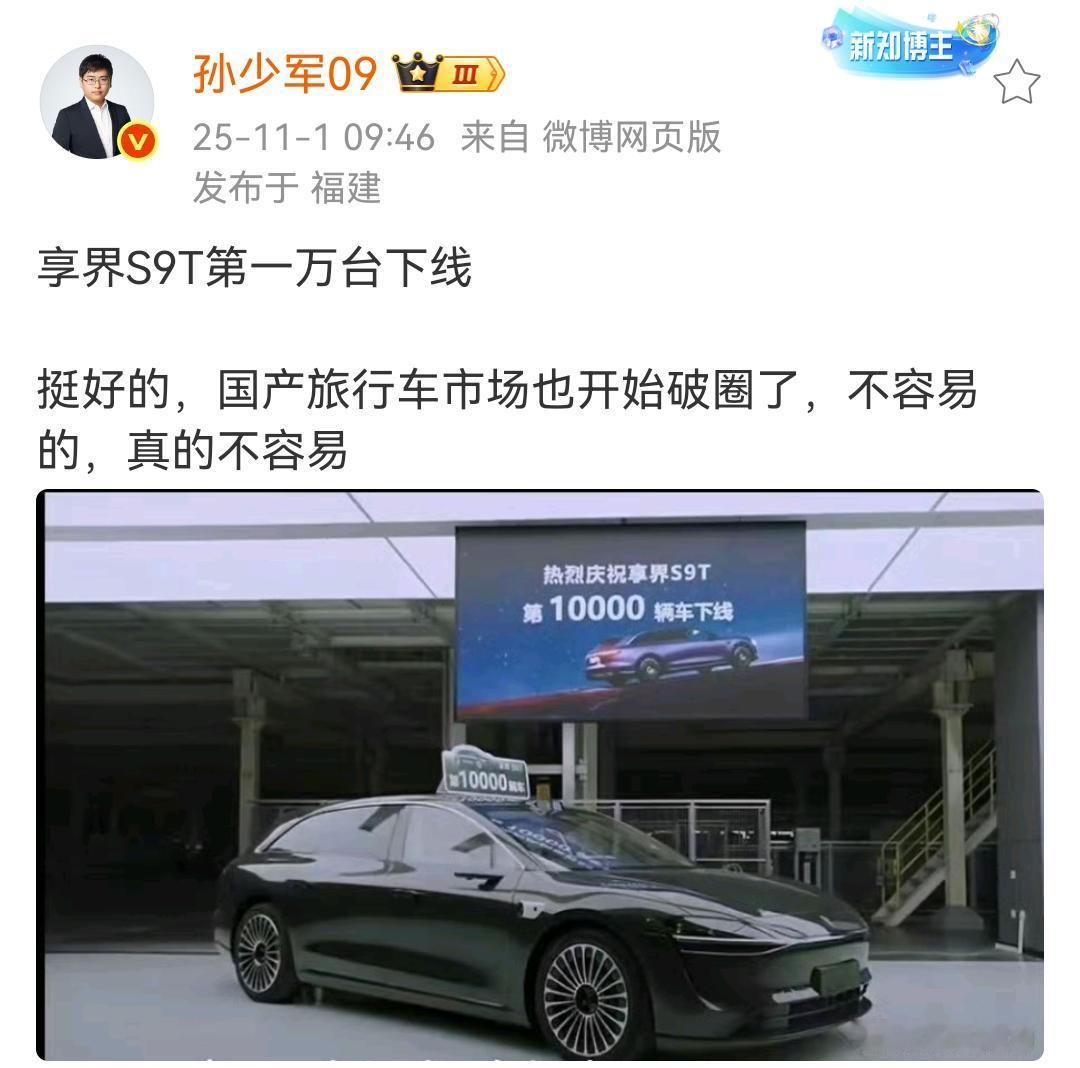 孙少军:享界S9T第一万台下线! 确实相当的不容易,旅行车在中国属于一个相对来说较为小众的市场,真正实现破圈非常的困难。所以要改变大家的认知,要让大家认识到旅行车是比轿车更加优秀的选择。 此前的蔚来ET5T卖的也挺不错的,这个车就实现了一个小规模的破圈,实用化可能也是让这种车型越来越受欢迎的原因之一。