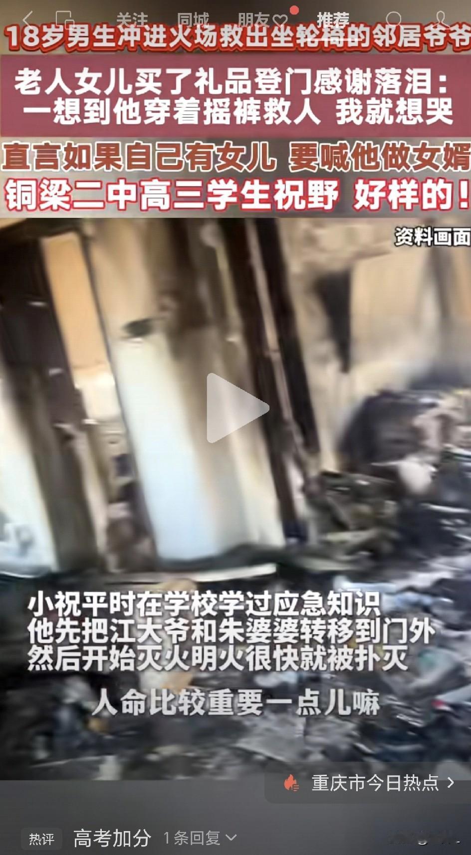 18岁高三男生仅着内裤冲进火海,勇救八旬邻家夫妇!老人女儿含泪:你就是我们全家的恩人,若有女愿招为婿! 10月30日,重庆,一对八旬高龄的独居老夫妻,在家里给轮椅充电时,电瓶突发火灾,两个老人被困屋内。 千钧一刻,邻居家18岁的高三男生小祝,来不及穿衣服,仅着内裤、赤着脚冲进老人家里。 小祝冷静地转移两位老人到安全区域,随后切断电源并尝试灭火。 过后,老人女儿江女士含泪致谢,称小祝为父母“救命恩人”,并说“若有女儿愿招其为婿”。 而小祝所在的学校也同样收到家属致谢,班主任评价其“勇敢、乐于助人”,并透露其为羽毛球特长生,连续两年获校赛冠军。 这是一位德智体美劳全面发展的优秀学子!长得也很帅! 网友们纷纷为小祝同学点赞: “中国好少年!这才是学习榜样!” “申请给小祝高考加分!” “这小伙子眉.清目秀,确实很正!” “小帅哥人帅心好,高考应该加分,树立社会正能量。” “这孩子一脸正气,将来肯定是要上交国家的!” “小伙子好样的!” “应该好好嘉奖!” “少年强则国强!” 乐于助人,很多人能做到。但这位18岁少年在危急关头展现出的勇敢、冷静是很多人所不具备的。 这也说明,我们现在的学校教育并不像有些人口中的那么不堪和落后。而是,个人是否认真对待、努力接受,并将其转化为自己的隐藏技能,随时可以应用到生活当中。 给勇敢、冷静又多才多艺的小祝同学点赞! 愿他明年夏季:金榜题名!蟾宫折桂!顺利考入自己理想的大学! 信息来源于半岛都市报,侵联删!