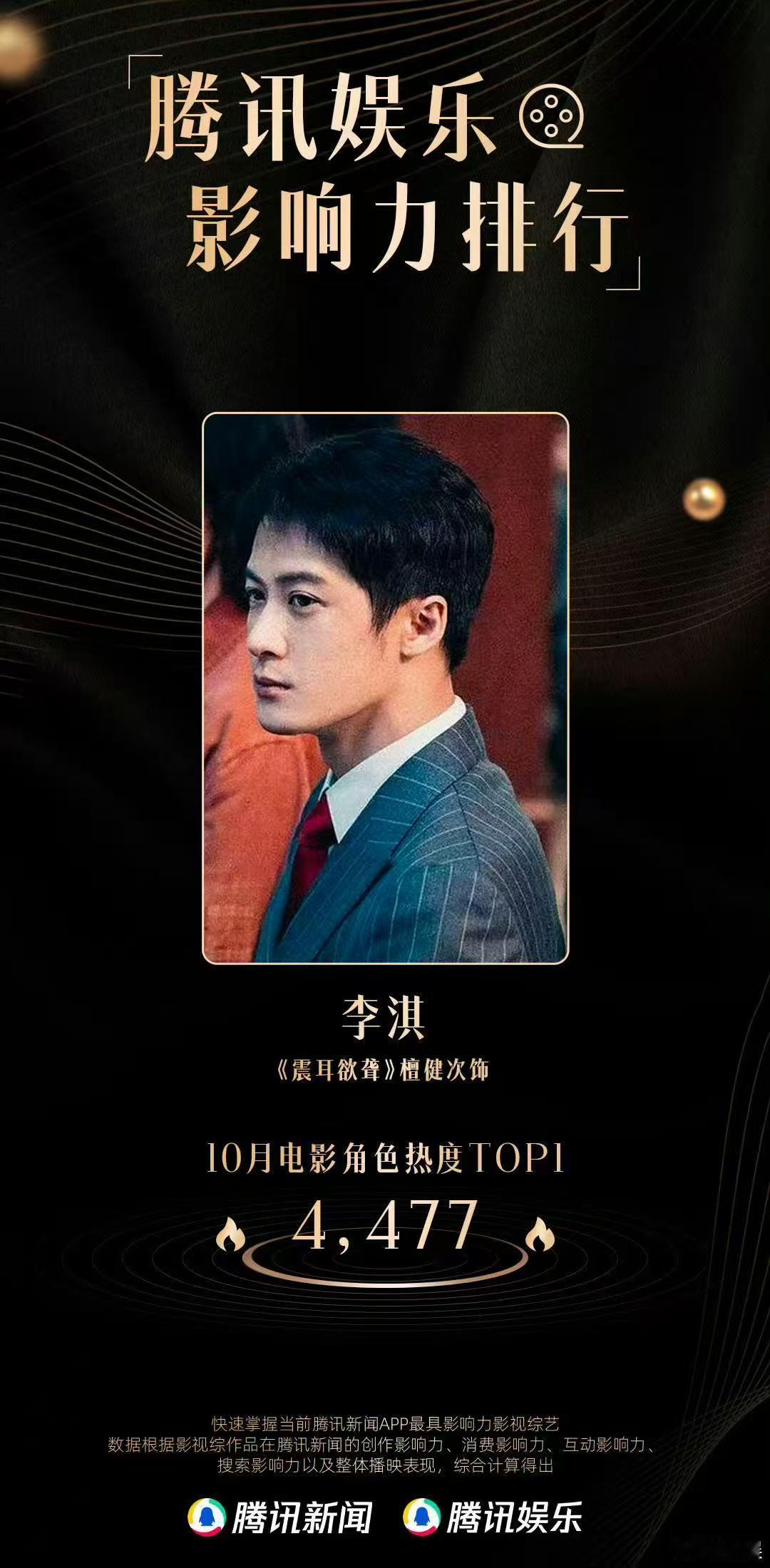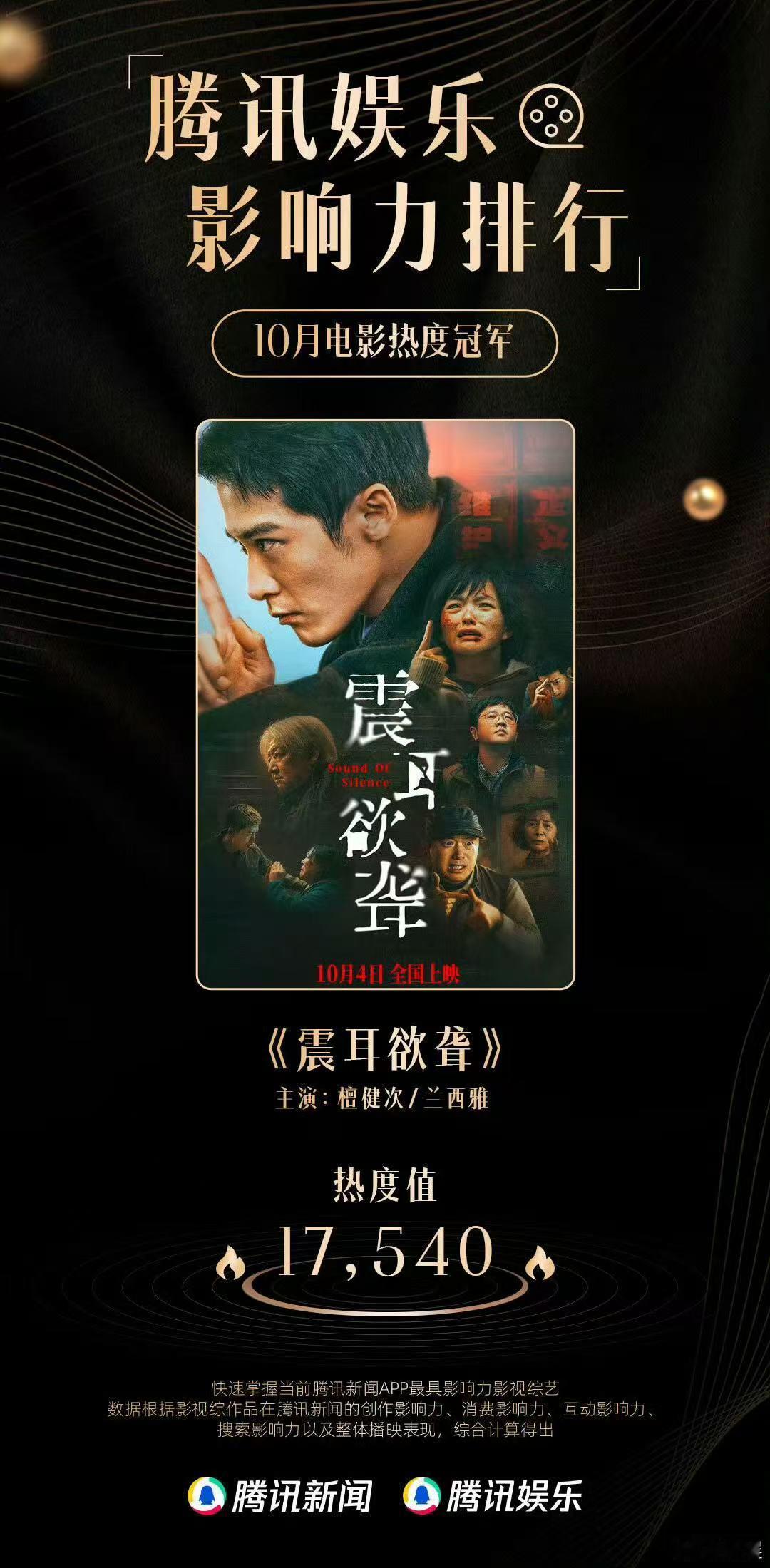 恭喜由檀健次领衔主演的电影《震耳欲聋》荣登10月电影热度榜冠军!他也凭借对“李淇”一角的深情塑造,成功摘得月度电影角色热度榜首!期待他更多优秀的作品~新娱